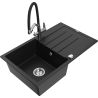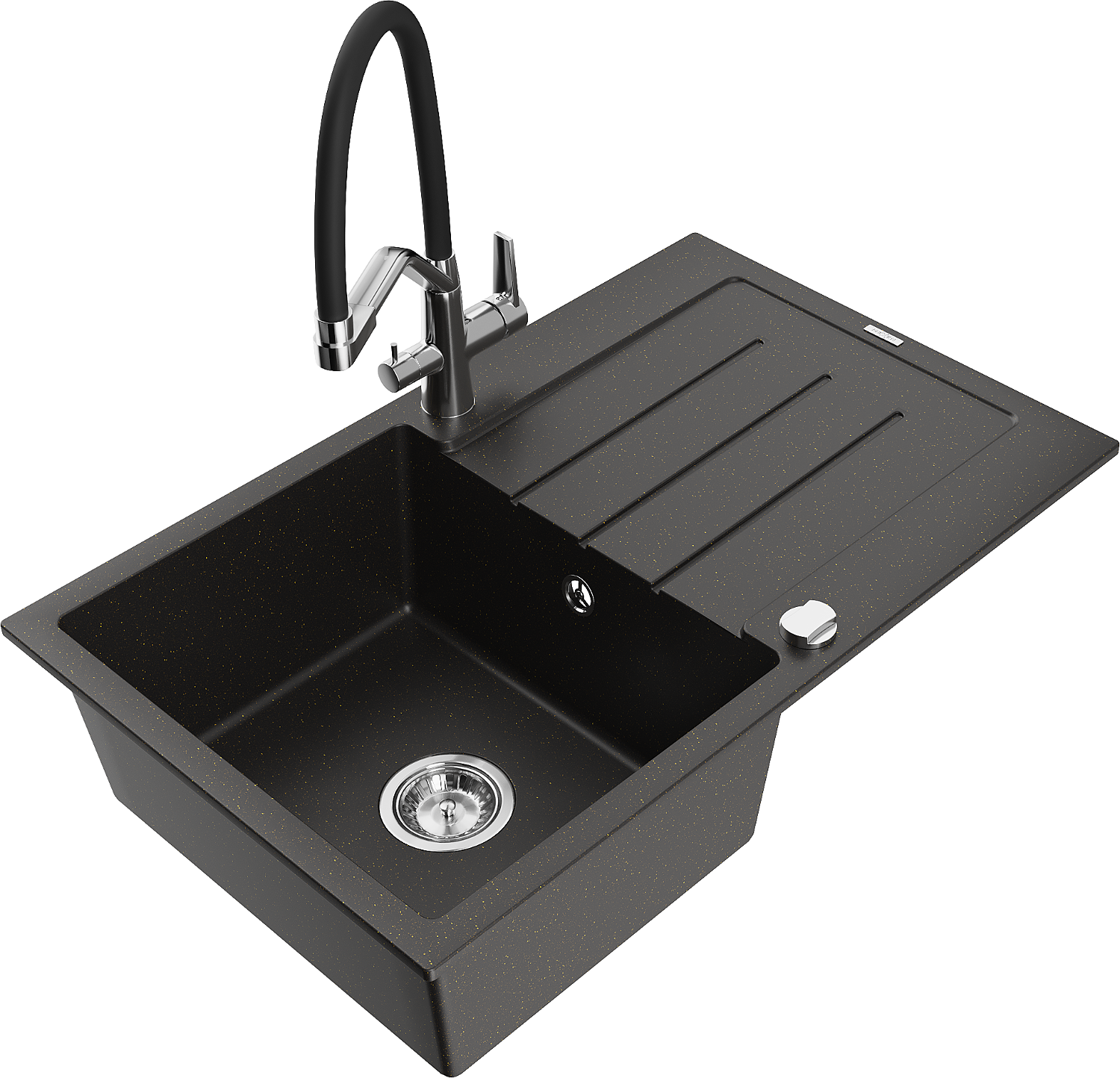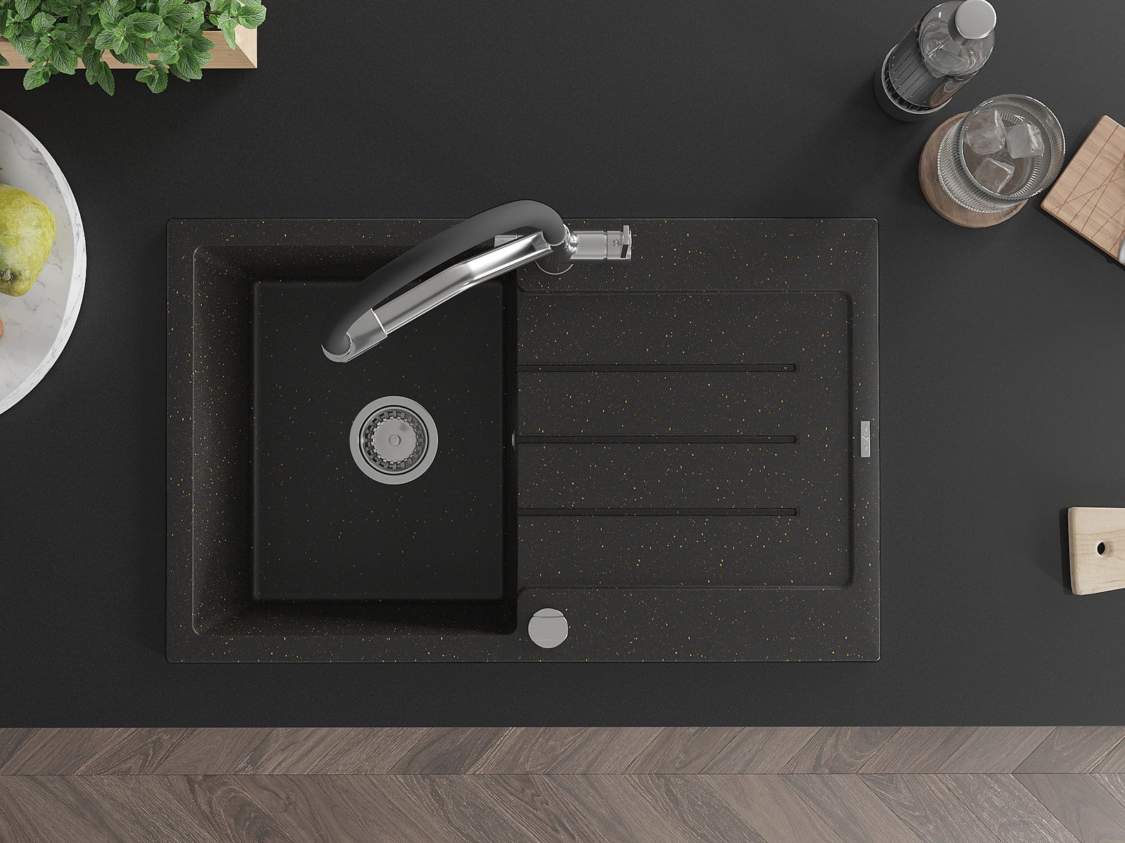 Mexen Bruno granitinė vienos plautuvės kriauklė su nusausintuvu ir virtuviniu maišytuvu Duo, juoda/auksinė metalo spalva