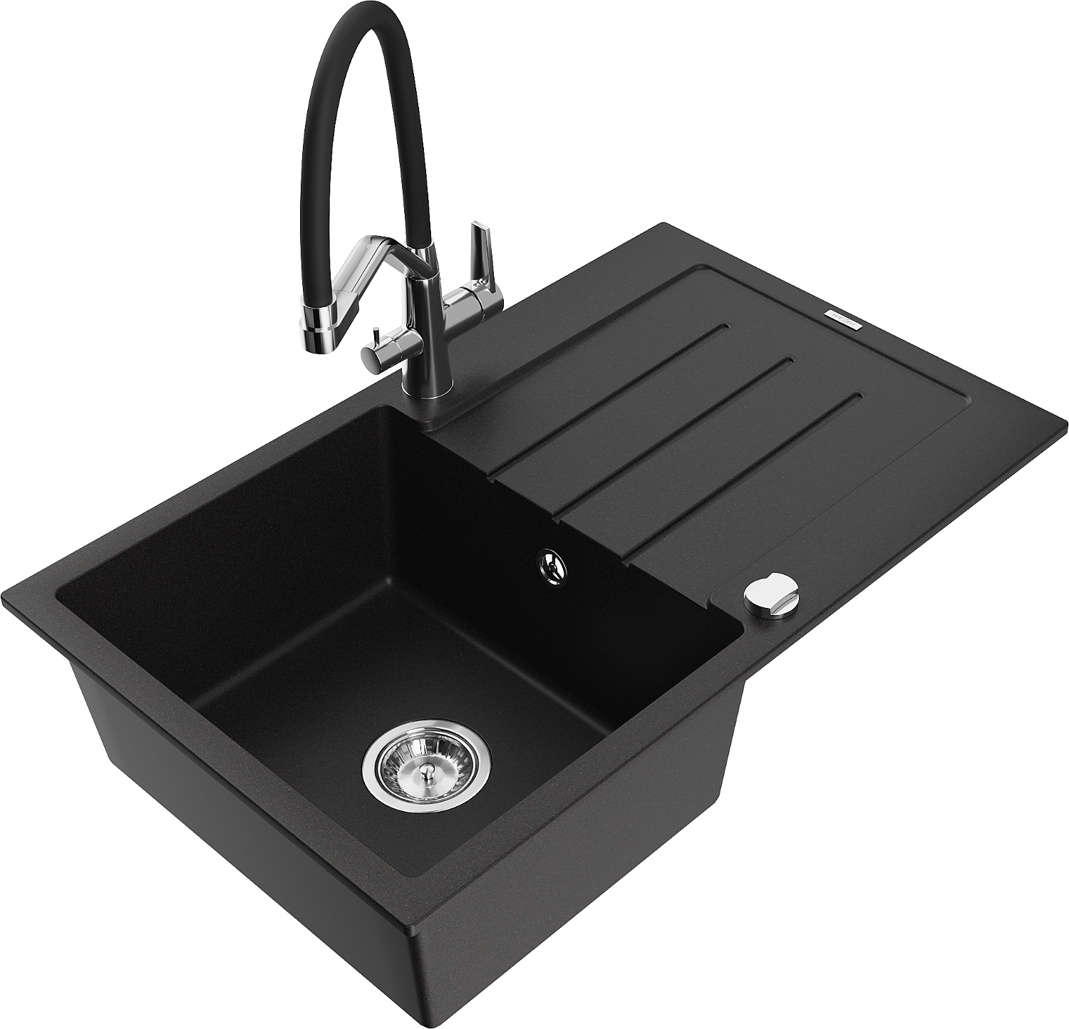 Mexen Bruno granitinis vienos kameros plautuvė su nutekėjimo zona ir virtuviniu maišytuvu Duo, juoda - 6513-77-671701-07