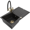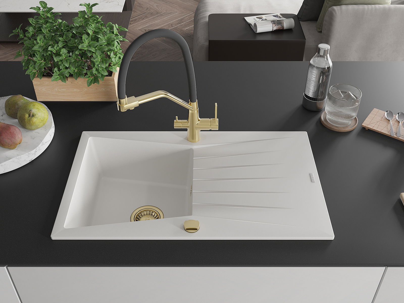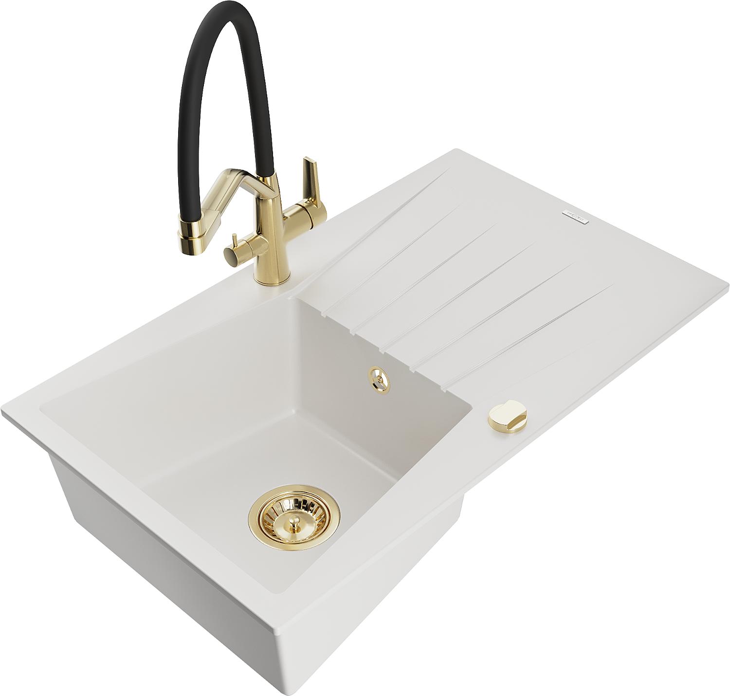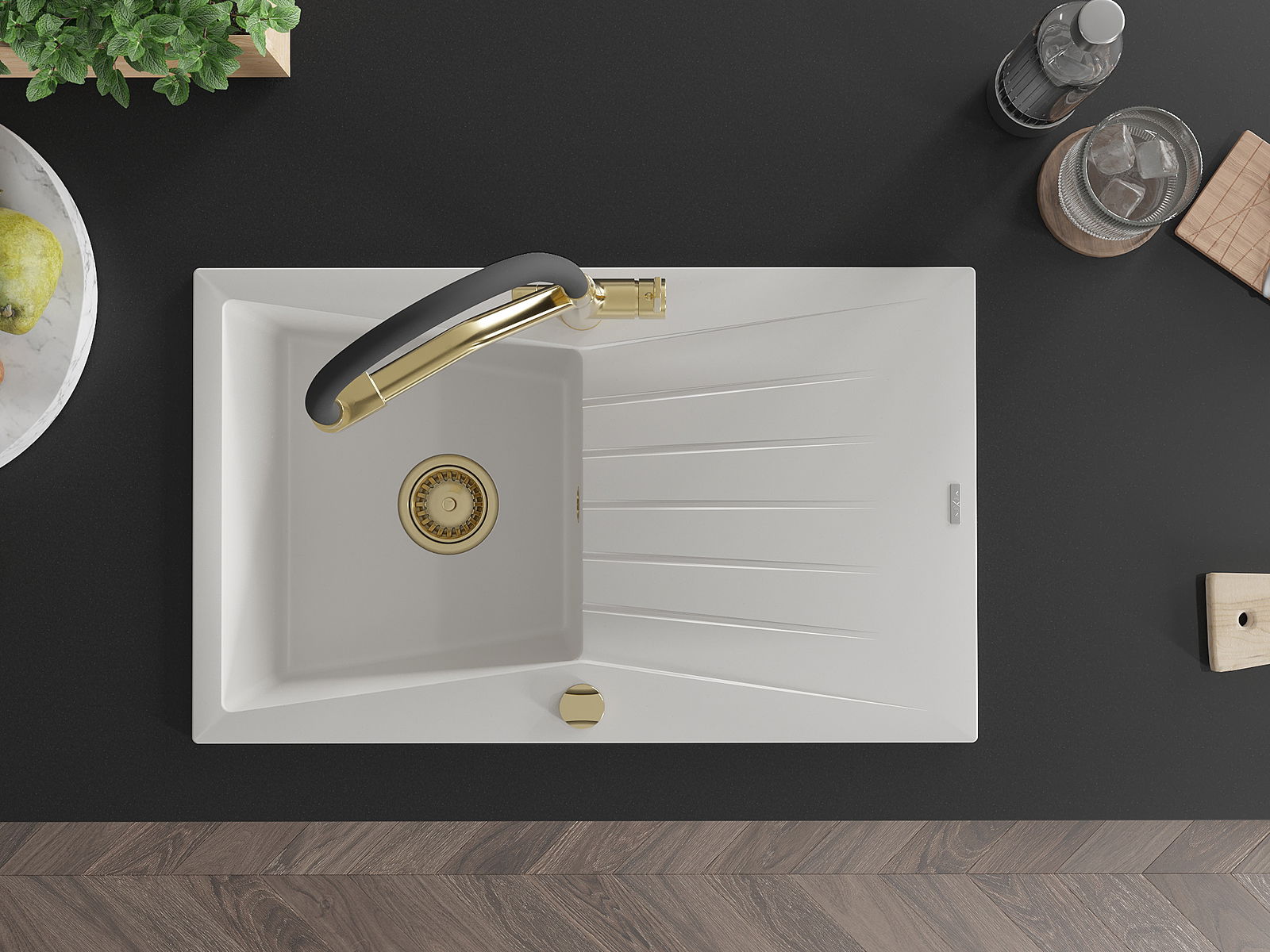 Mexen Cesar stačiakampė granitinė plautuvė su nutekamąja zona ir virtuviniu maišytuvu Duo, balta - 6514-20-671701-57-G