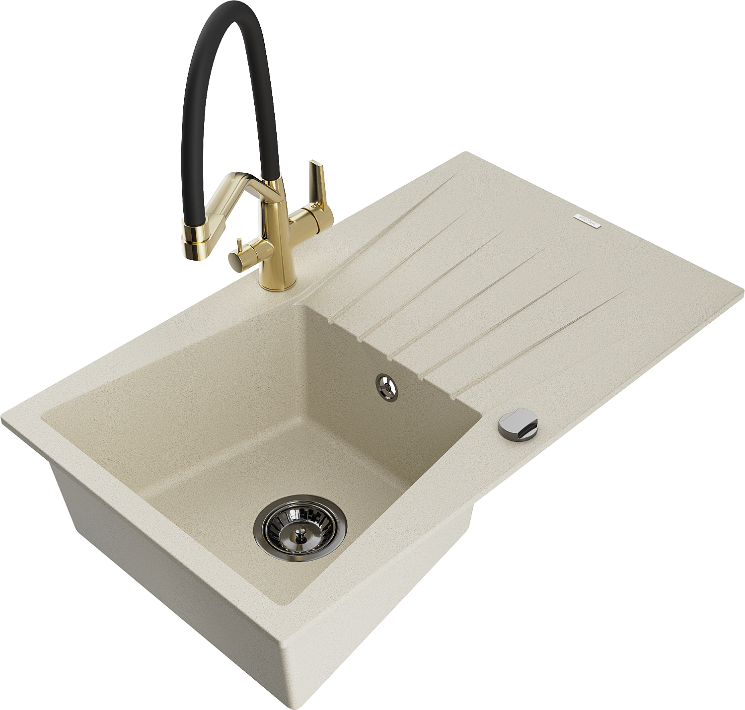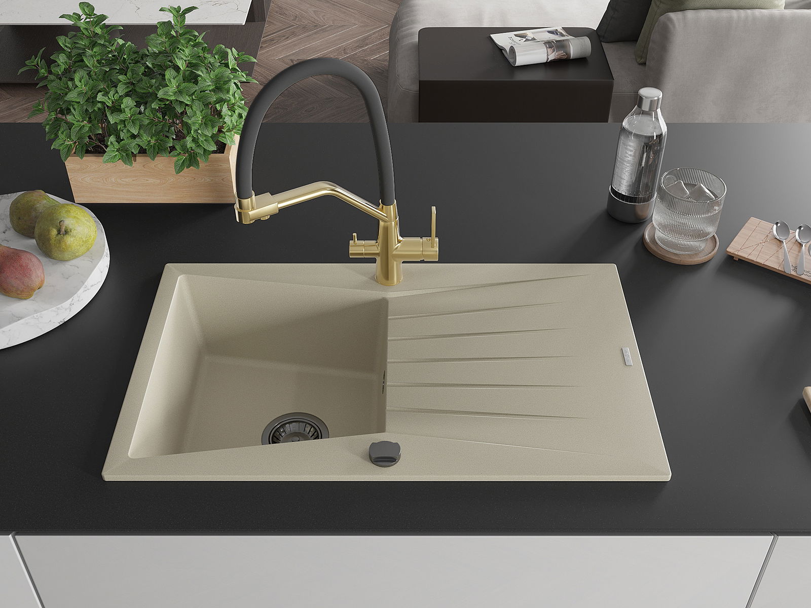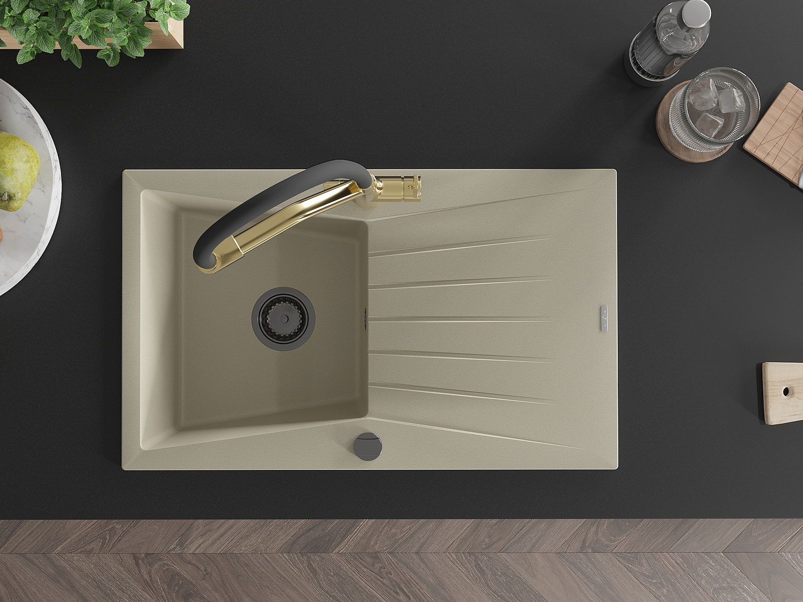 Mexen Cesar granitinė vienos kameros kriauklė su nusausintoju ir Duo virtuviniu maišytuvu, smėlio spalvos - 6514-69-671701-57-B