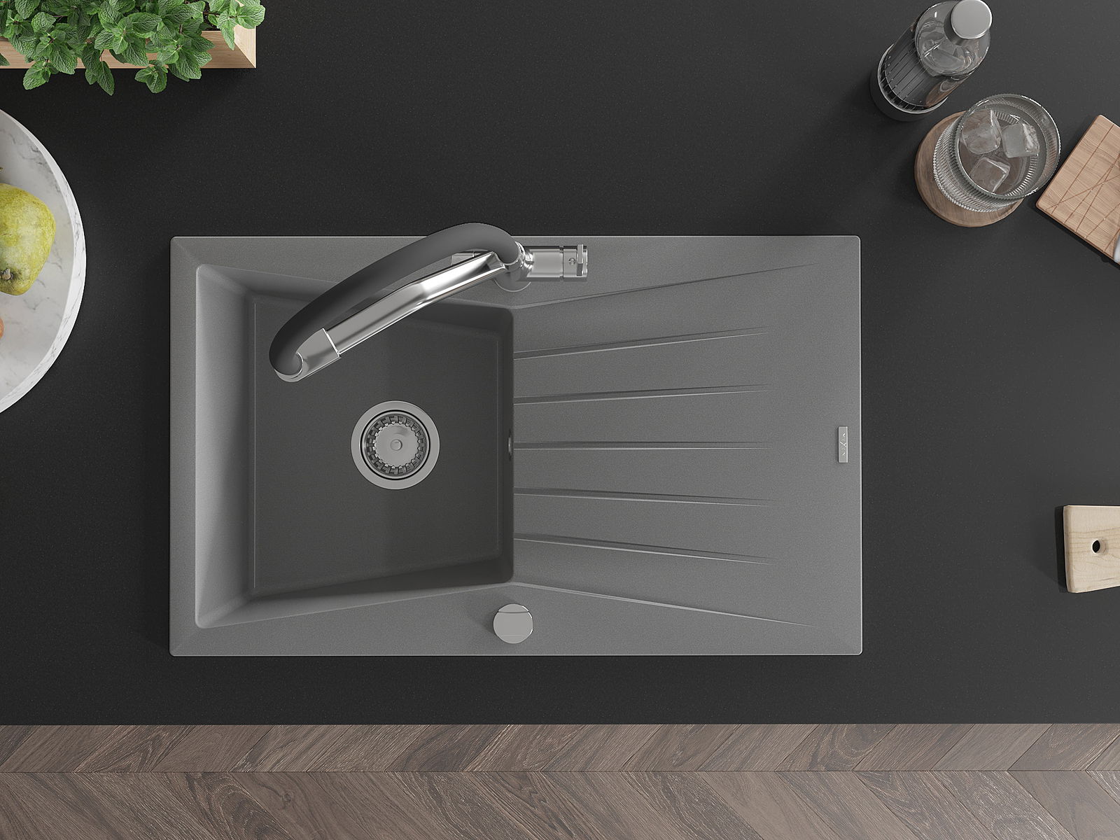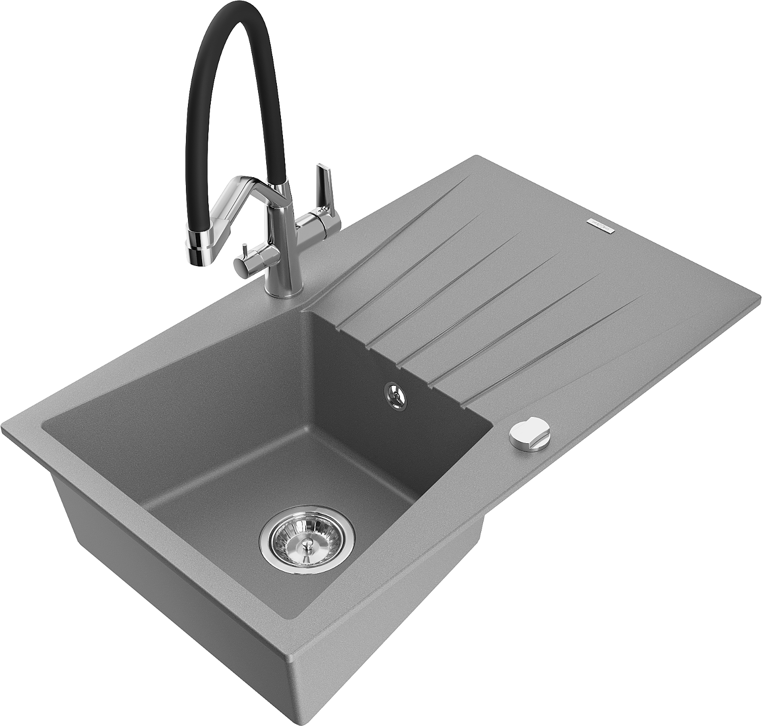 Mexen Cesar granitinis vienos sekcijos plautuvė su nutekamuoju padėklu ir virtuviniu maišytuvu Duo, pilkas - 6514-71-671701-07