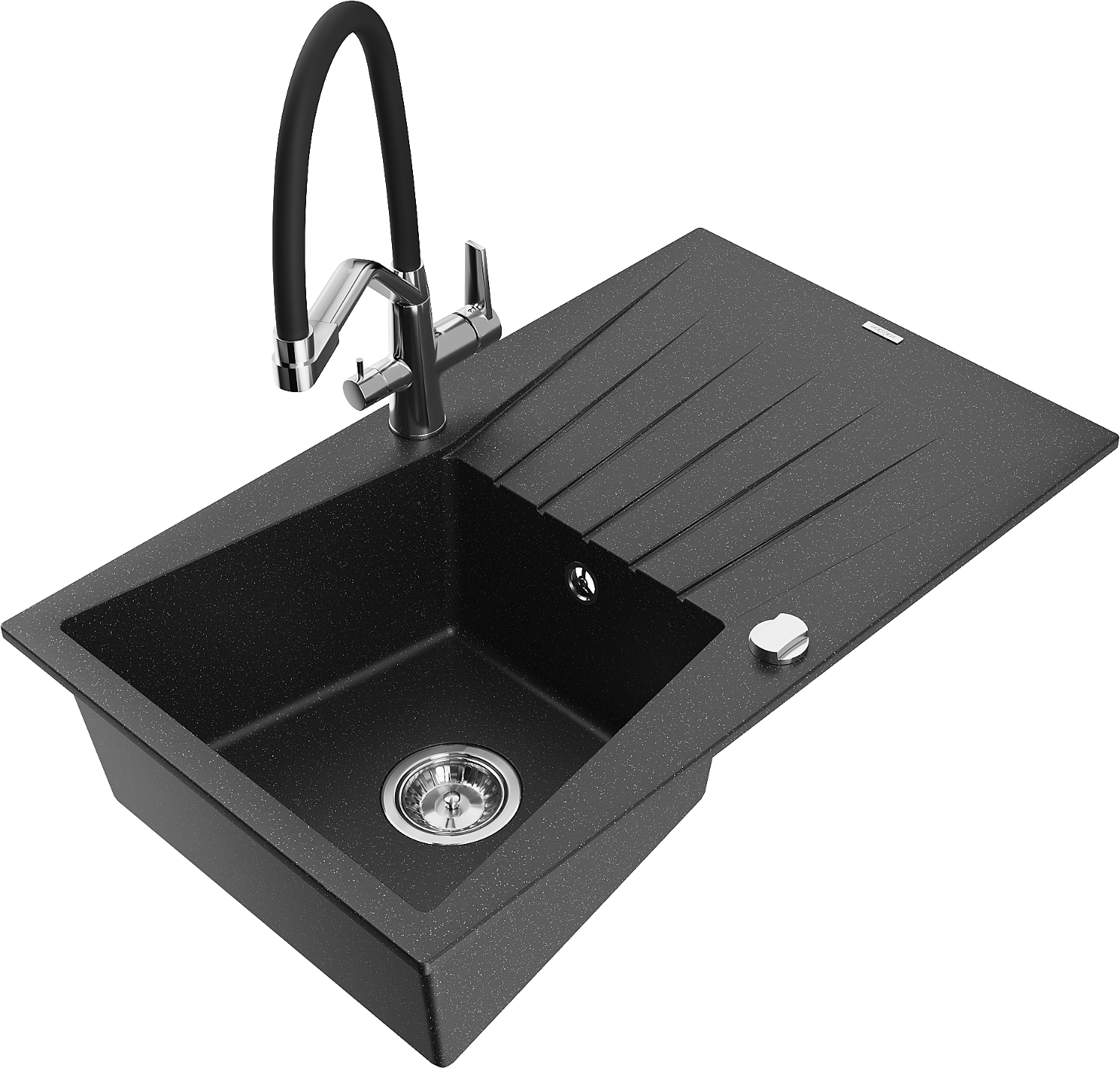 Mexen Cesar vienos kameros granitinė plautuvė su nutekamuoju paviršiumi ir Duo virtuviniu maišytuvu, juoda/sidabrinė