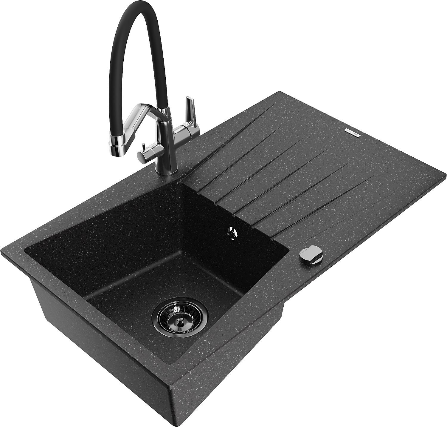 Mexen Cesar granitinė plautuvė su viena kamera, nusausinimo paviršiumi ir Duo virtuvės maišytuvu, juodos/spalvos sidabro