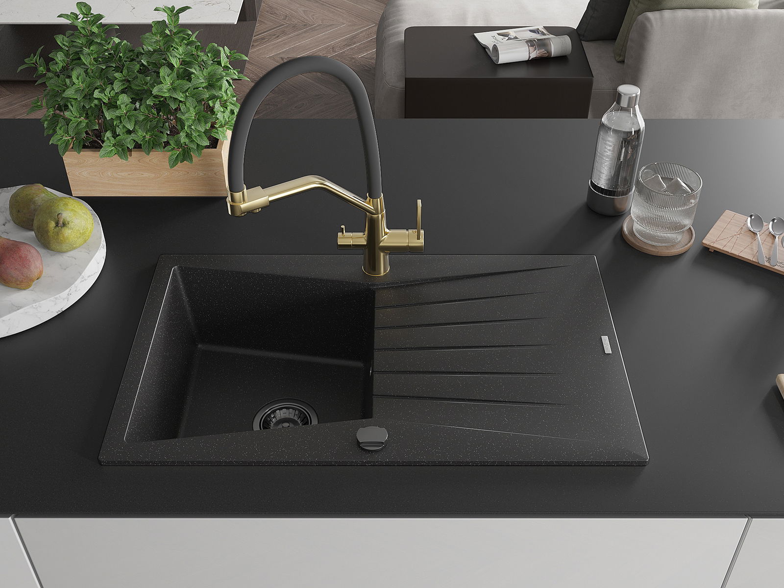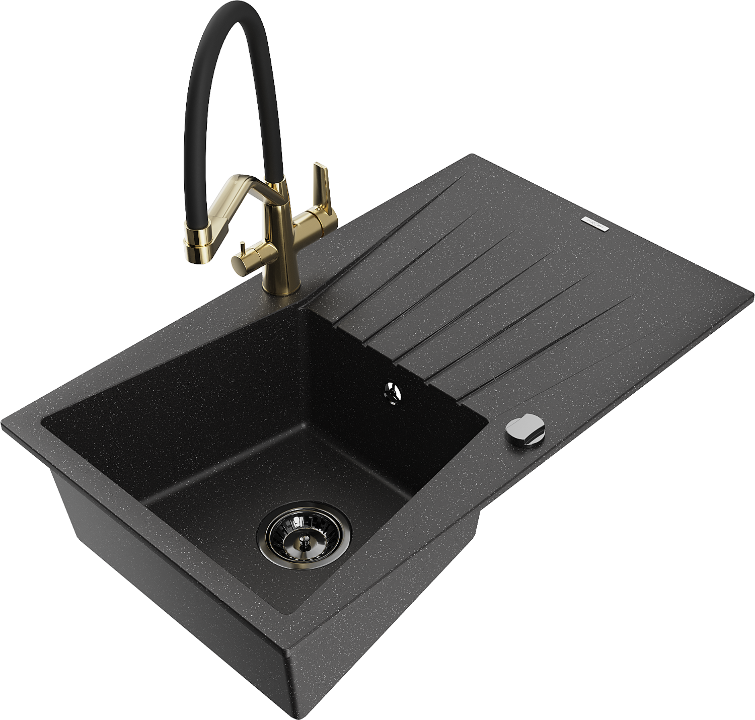 Mexen Cesar granitinė vienos kameros kriauklė su nusausintuvu ir virtuviniu maišytuvu Duo, juoda/sidabrinis metalikas