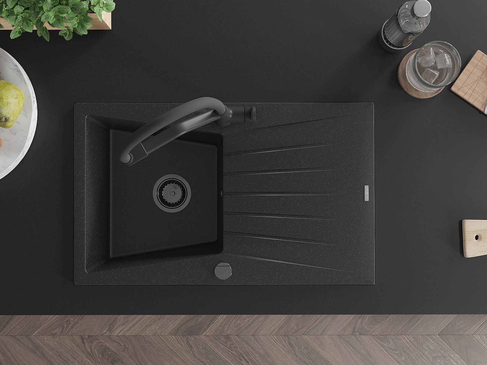 Mexen Cesar granitinė vienos plautuvės kriauklė su nuvarvėjimo zona ir virtuvės maišytuvu Duo, juoda/sidabrinė metalo