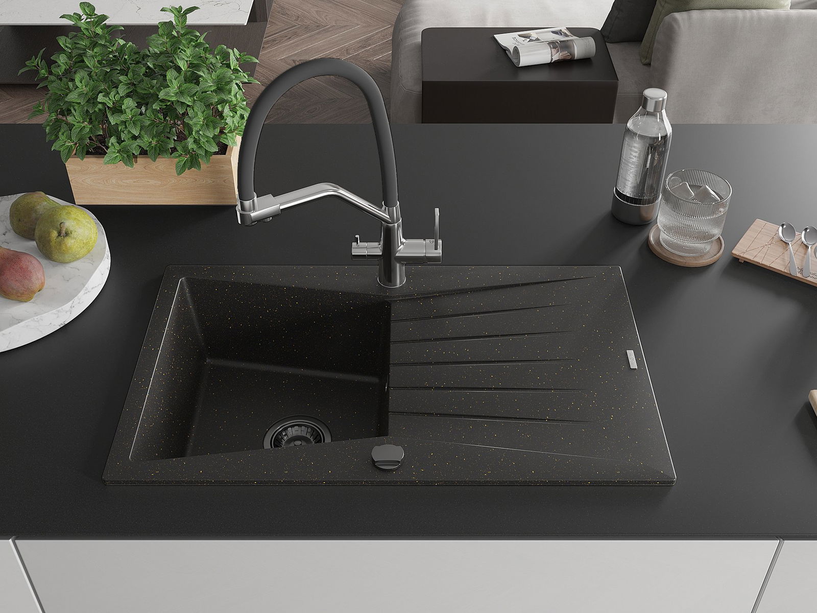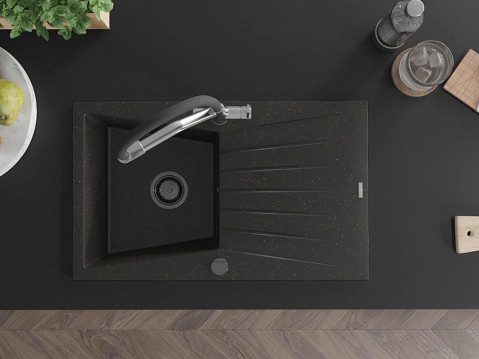 Mexen Cesar vienos kamerų granitinė kriauklė su nutekamuoju ir Duo virtuviniu maišytuvu, juoda/auksinė metalinė