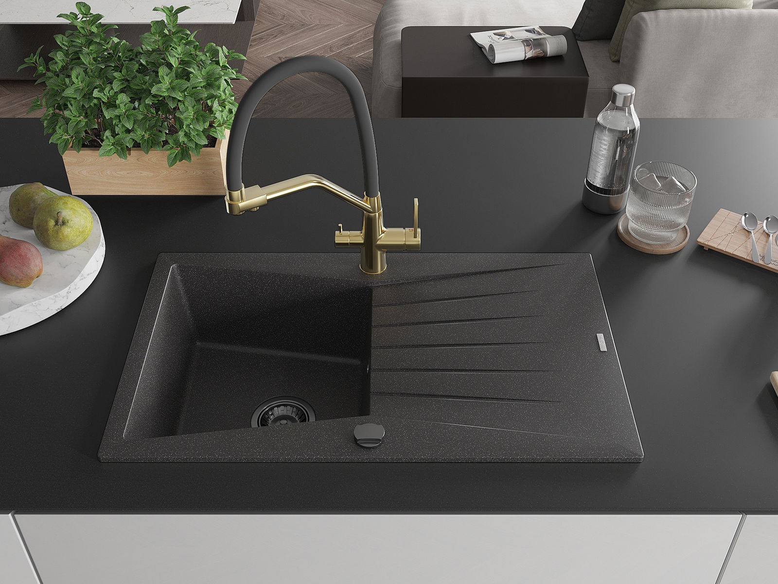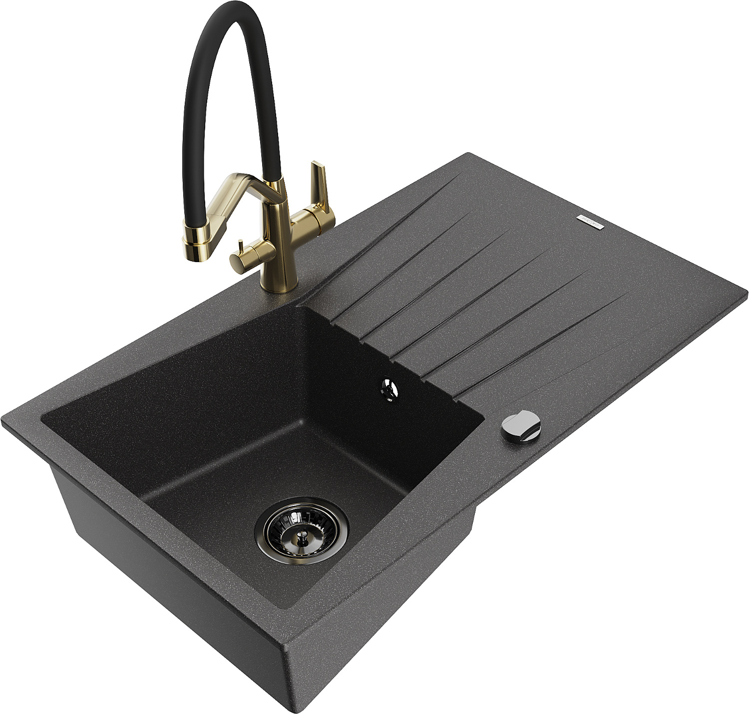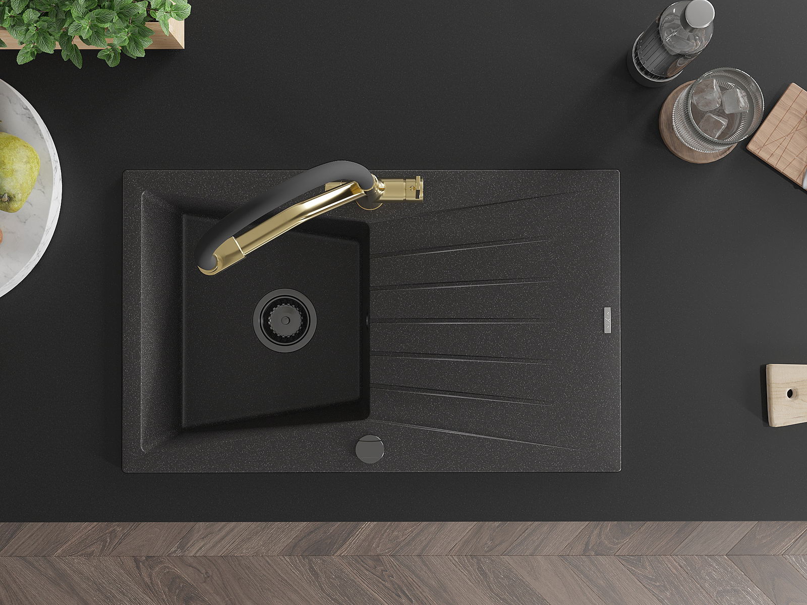 Mexen Cesar granitinė 1-aukštė kriauklė su varvančia dalimi ir virtuviniu maišytuvu Duo, juoda dėmėta - 6514-76-671701-57-B
