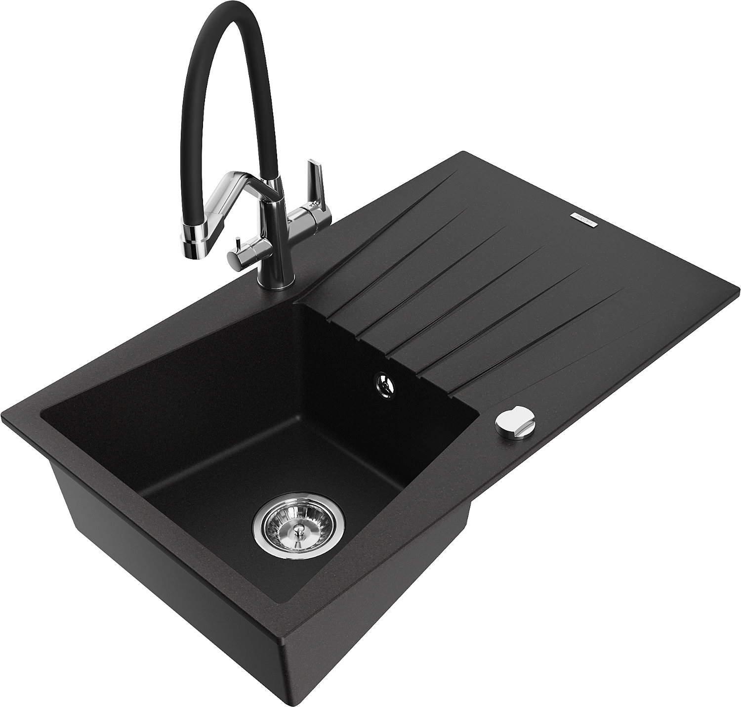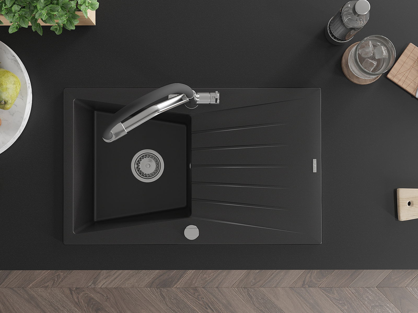 Mexen Cesar granitinė viena kamera plautuvė su nutekėjimu ir virtuvės baterija Duo, juoda - 6514-77-671701-07
