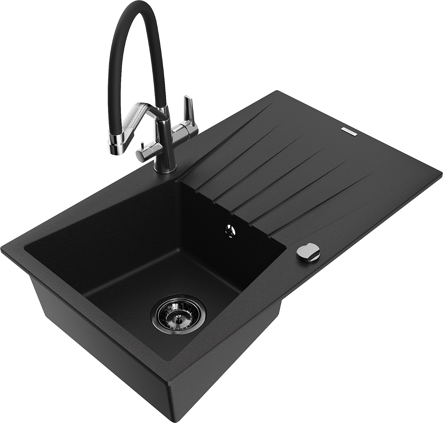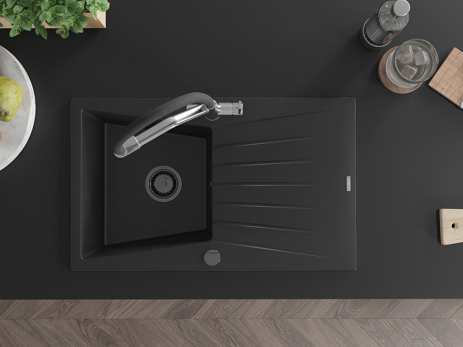 Mexen Cesar granitinė 1-dubens plautuvė su nutekėjimu ir Duo virtuvės maišytuvu, juoda - 6514-77-671701-07-B