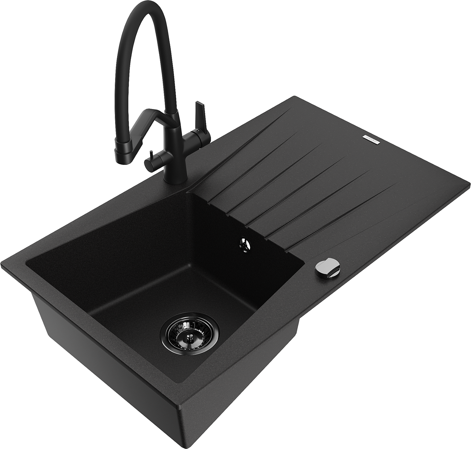 Mexen Cesar granito plautuvė vienos kameros su drenažu ir virtuviniu maišytuvu Duo, juodas - 6514-77-671701-70-B