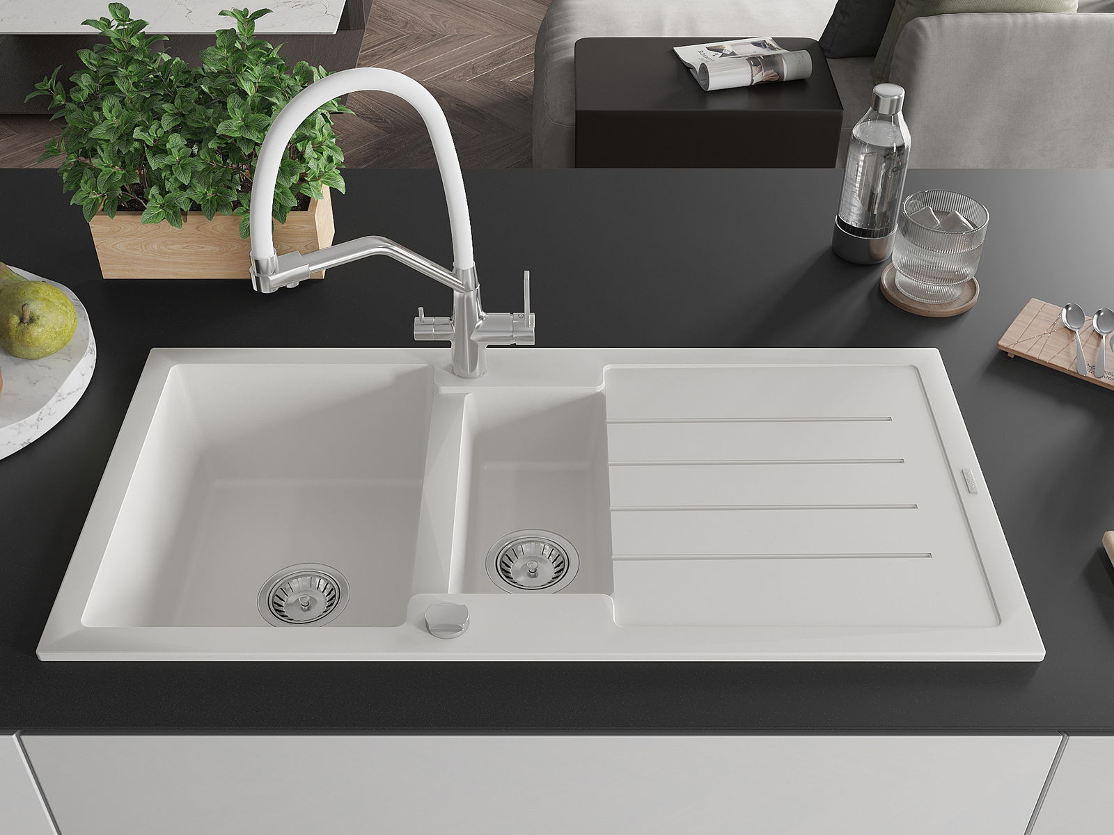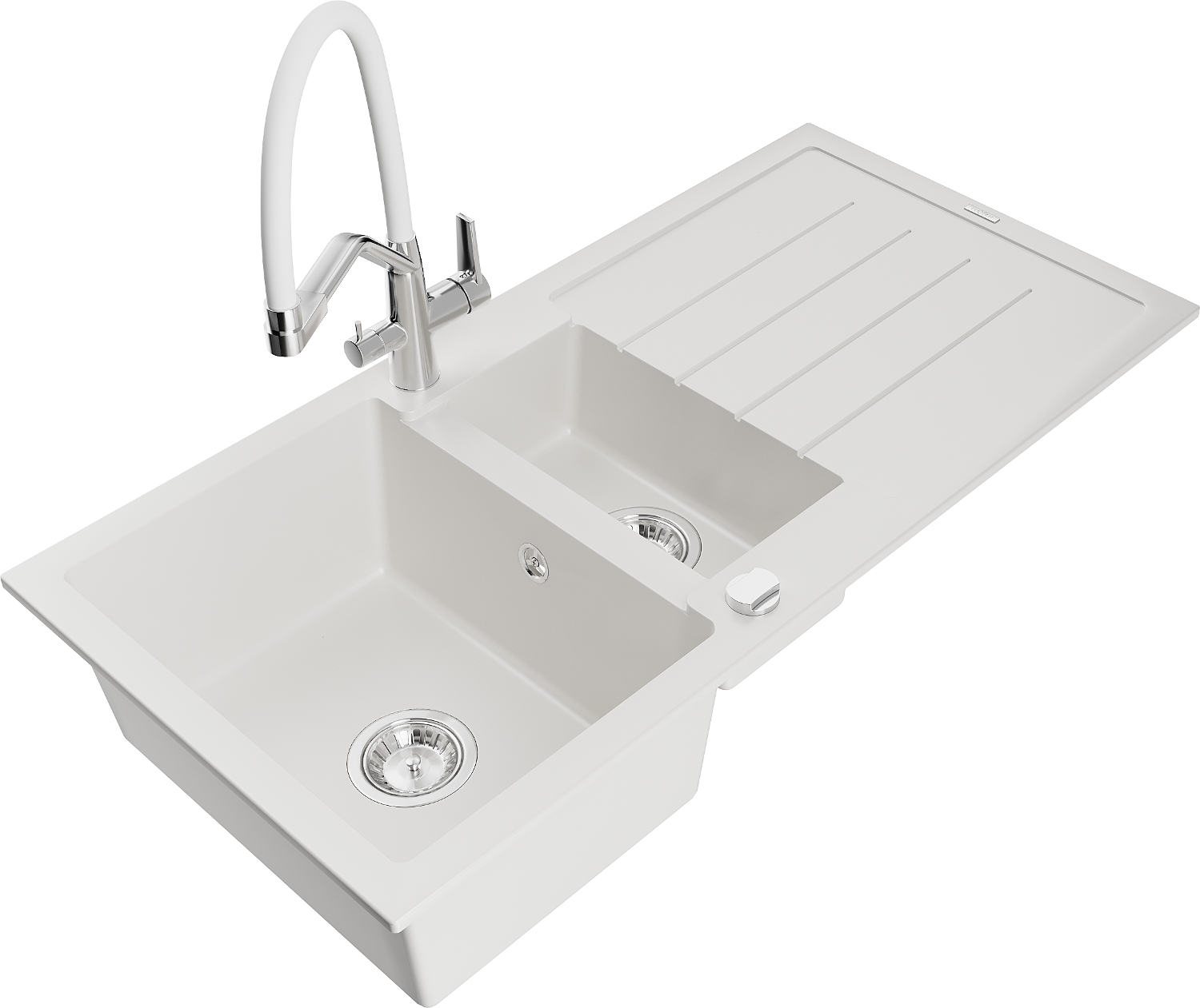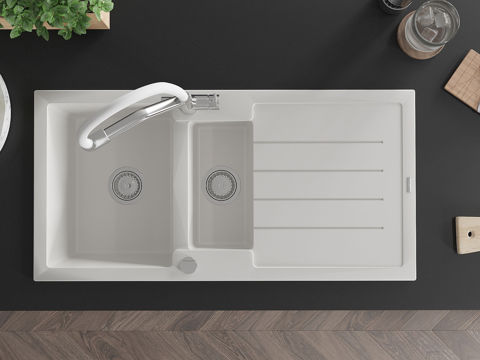 Mexen Andres granitinė 1,5 skylių plautuvė su nusausintuvu ir virtuviniu maišytuvu Duo, balta - 6515-20-671701-02