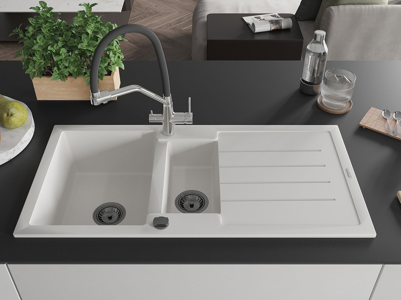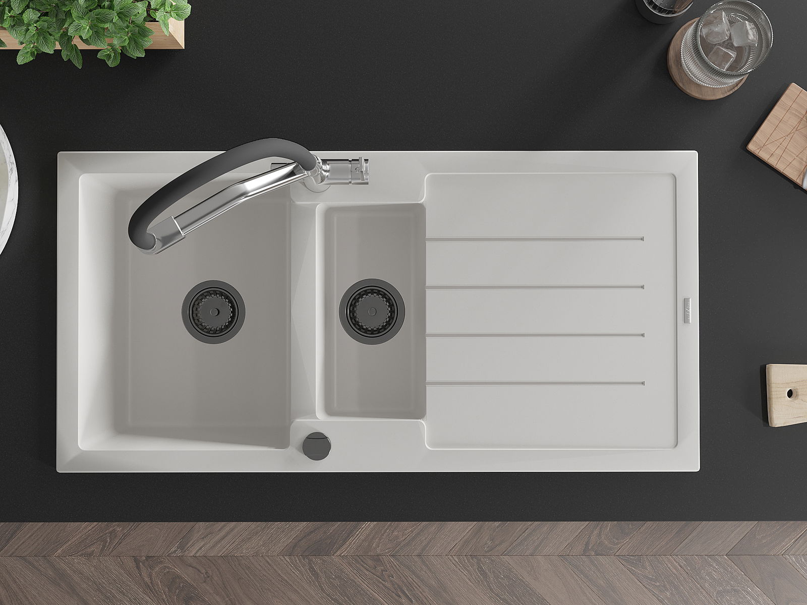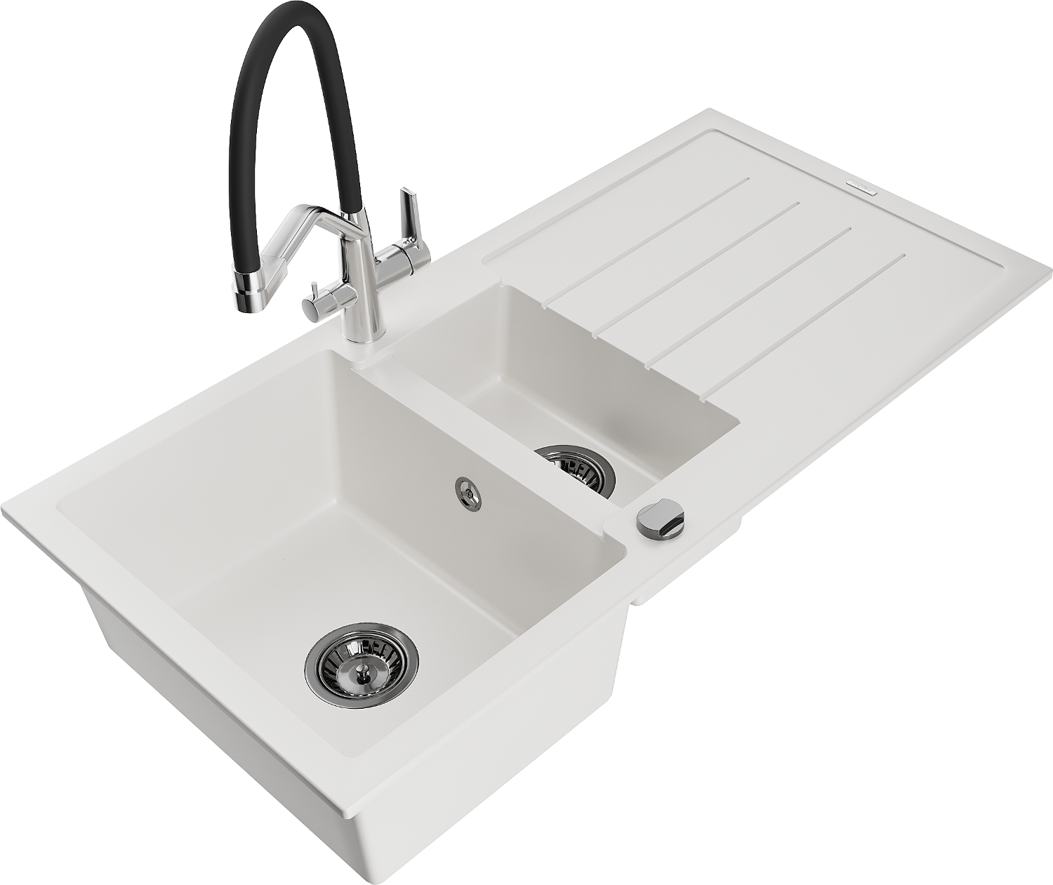 Mexen Andres granito plautuvė 1,5 kamerų su nutekėjimu ir virtuviniu maišytuvu Duo, balta - 6515-20-671701-07-B