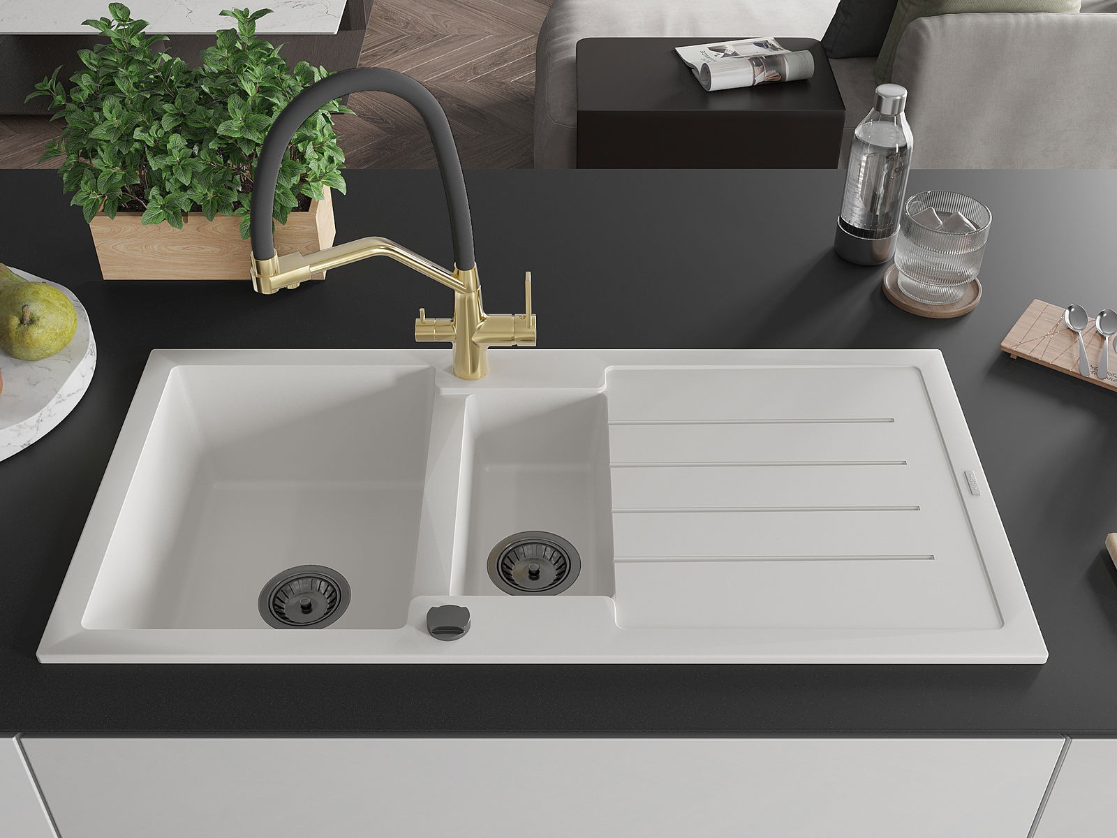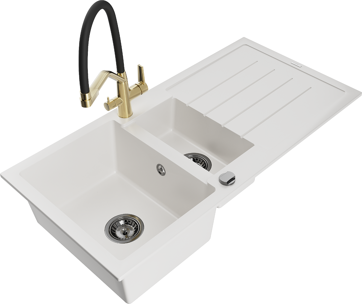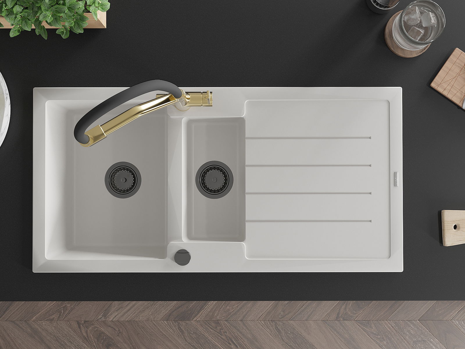 Mexen Andres granito kriauklė 1,5 skyrelio su indaplove ir virtuviniu maišytuvu Duo, balta - 6515-20-671701-57-B
