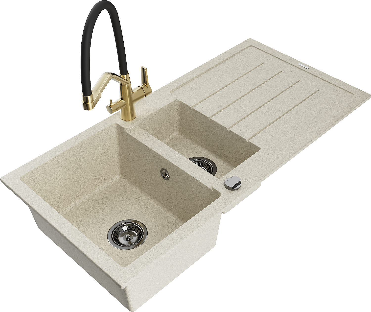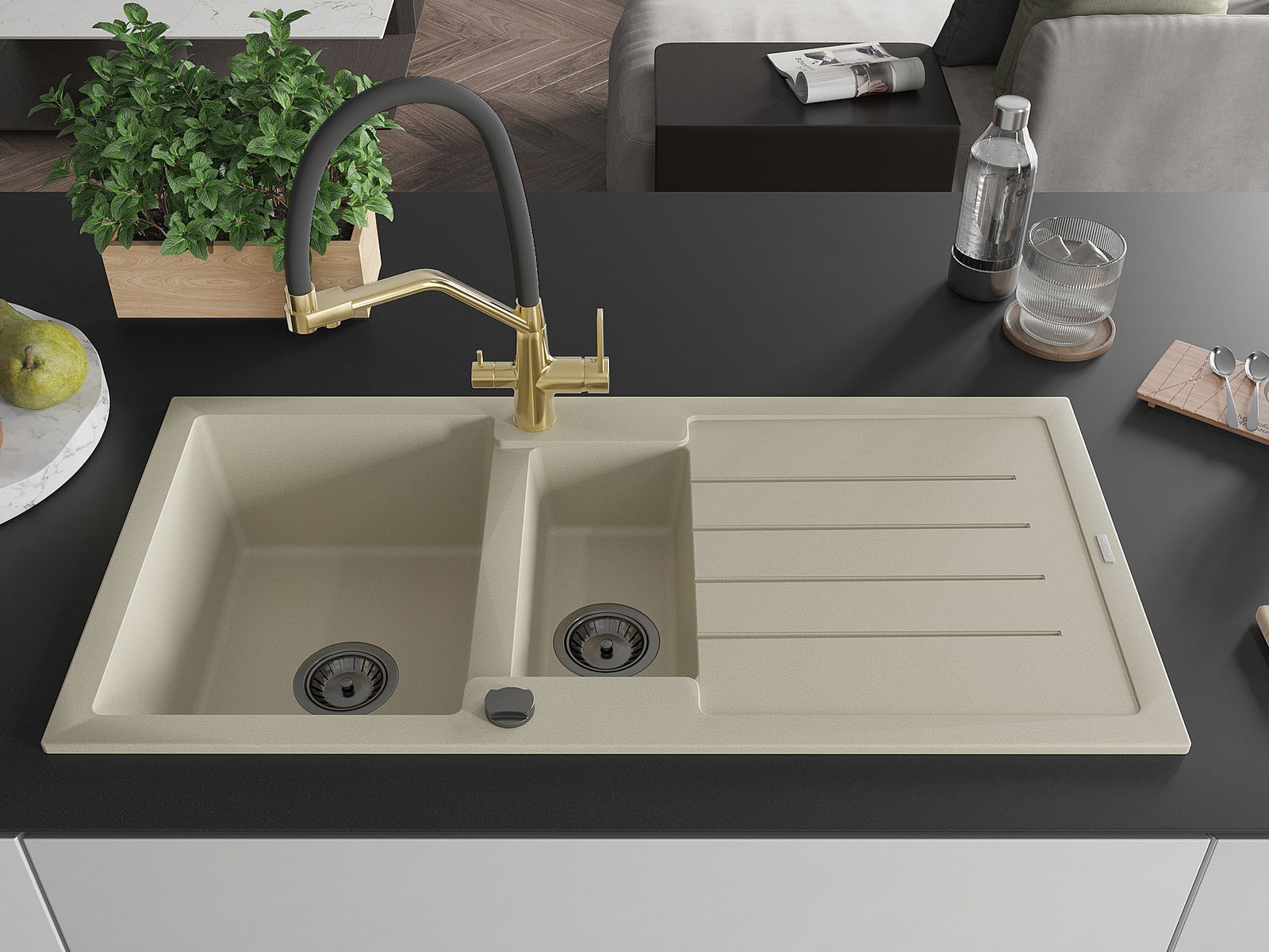 Mexen Andres granitinis 1,5 skylių plautuvas su drenažu ir virtuviniu maišytuvu Duo, smėlio spalvos - 6515-69-671701-57-B