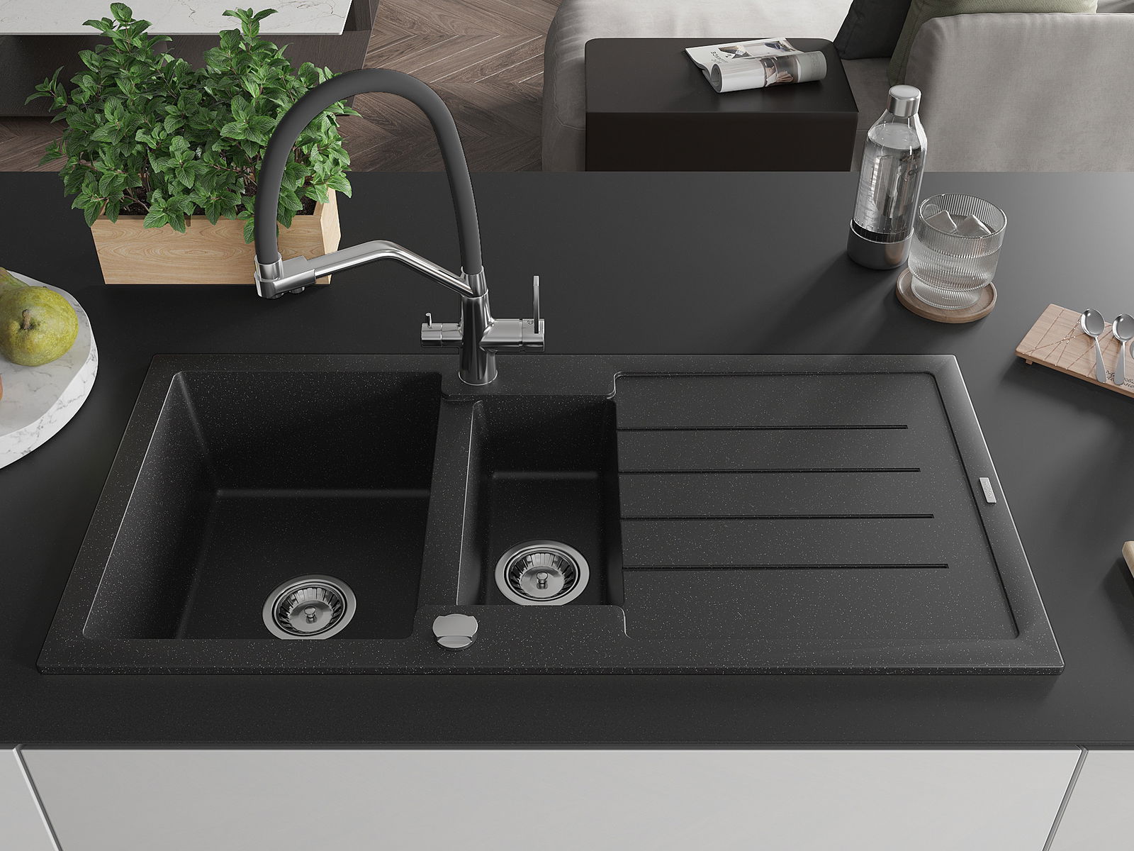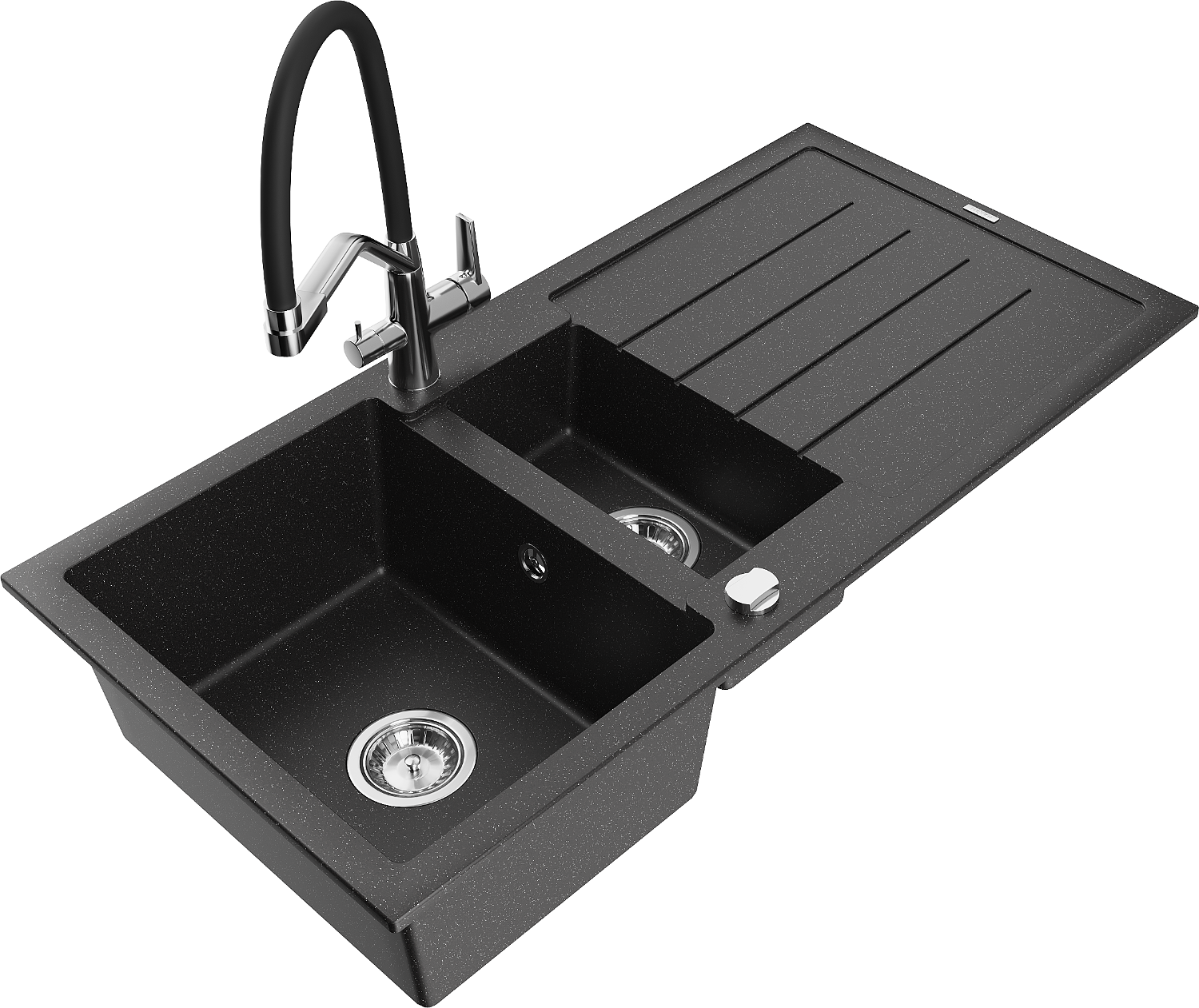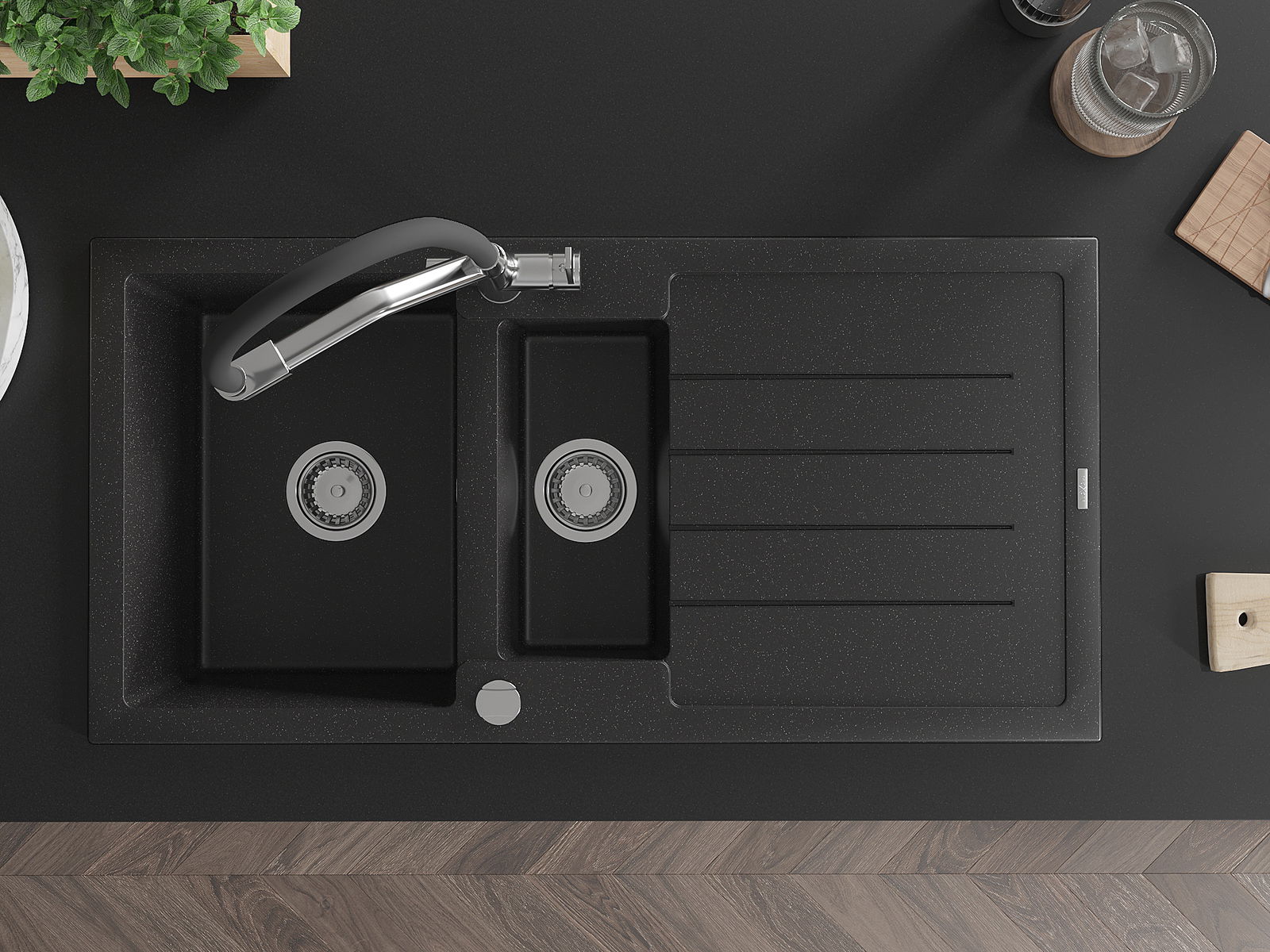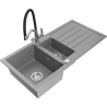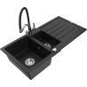 Mexen Andres granitinė 1,5 skylių plautuvė su nuvarvėtu ir Duo virtuviniu maišytuvu, juoda/sidabrinis metalikas