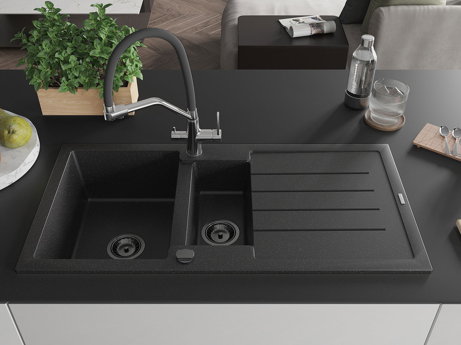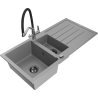 Mexen Andres granito plautuvė su 1,5 kameromis, drenažu ir virtuviniu maišytuvu Duo, juoda/sidabrinė - 6515-73-671701-07-B