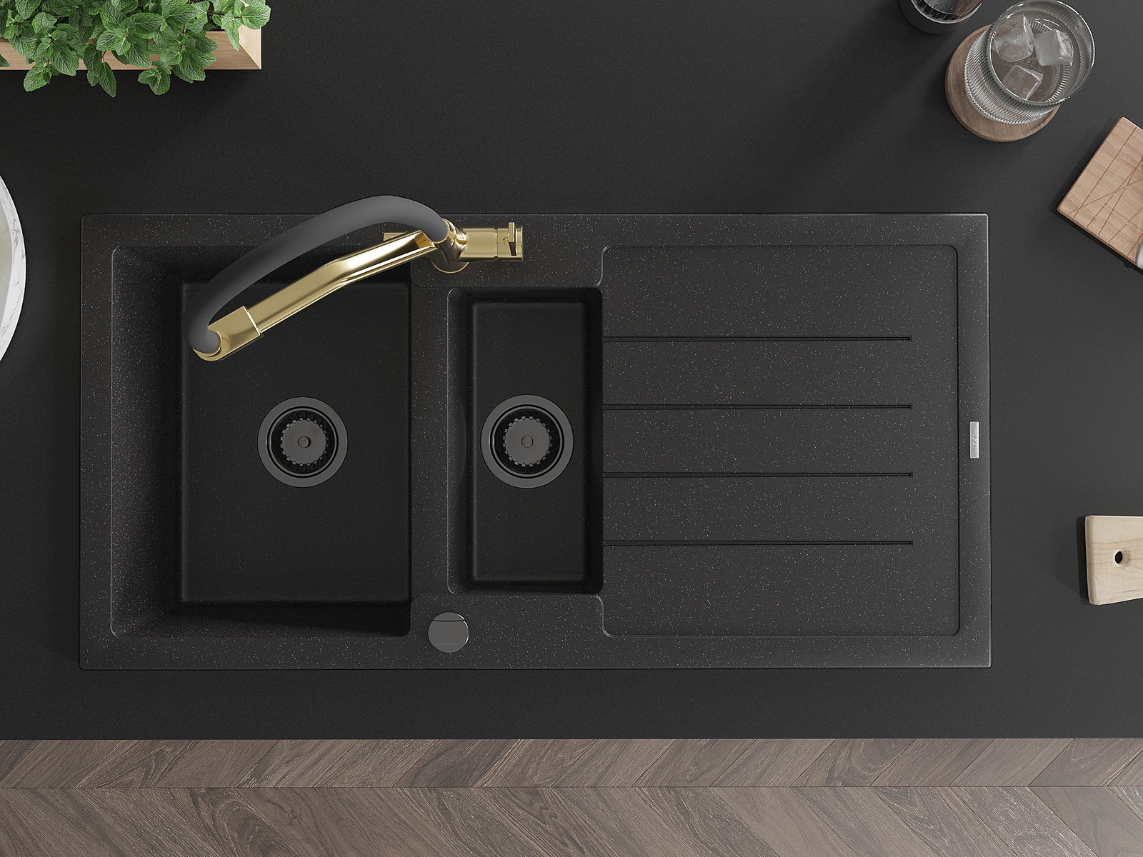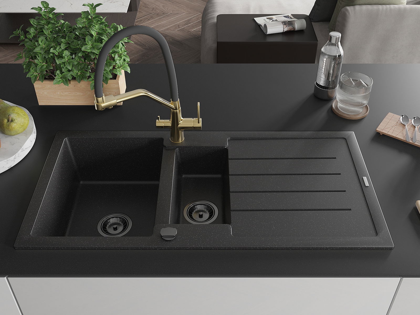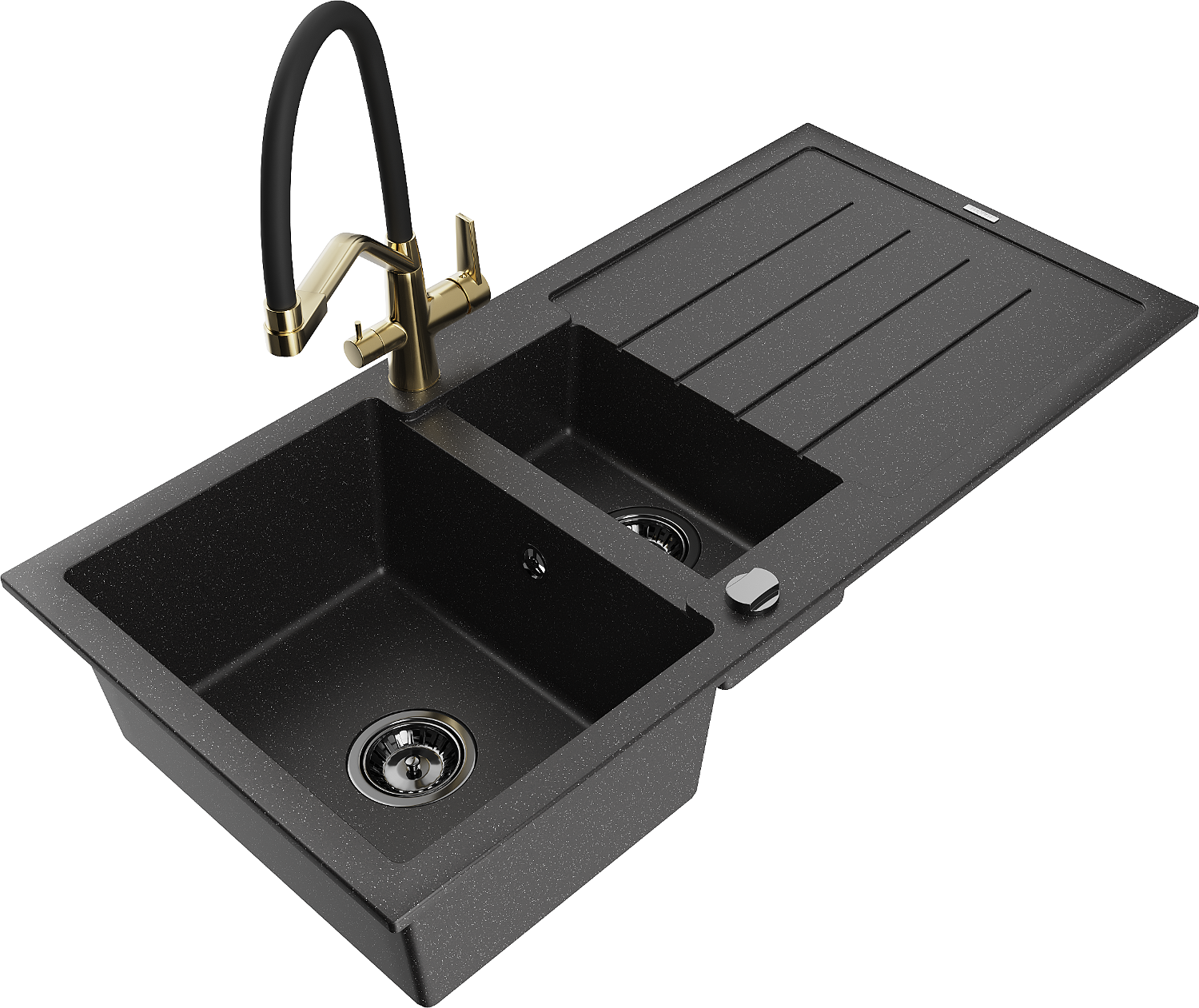 Mexen Andres granitinis 1,5 sekcijų kriauklė su nusausintuvu ir Duo virtuviniu maišytuvu, juoda/sidabrinė - 6515-73-671701-57-B