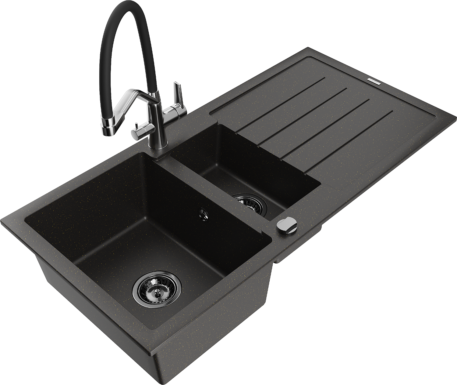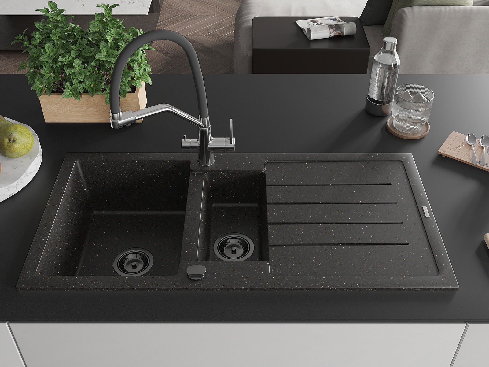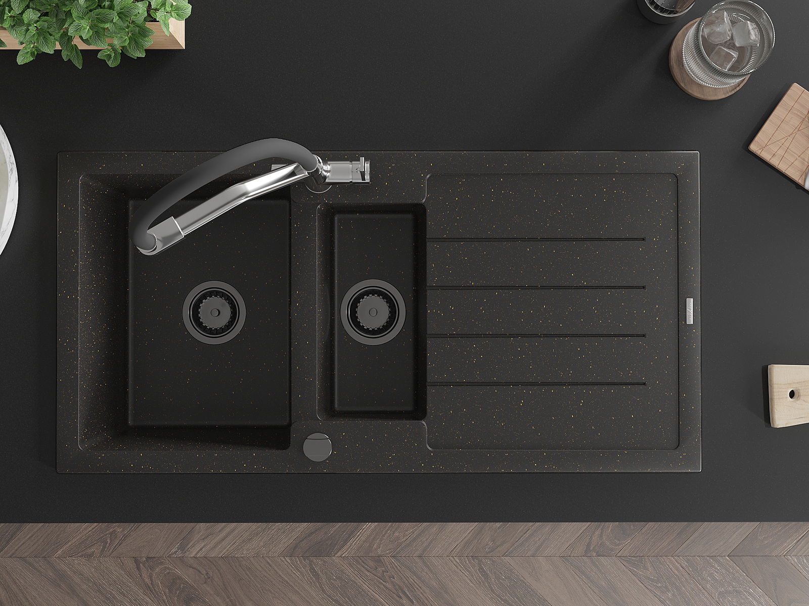 Mexen Andres granitinė 1,5 kamerų plautuvė su nusausintuvu ir virtuviniu maišytuvu Duo, juoda/auksinė metalika