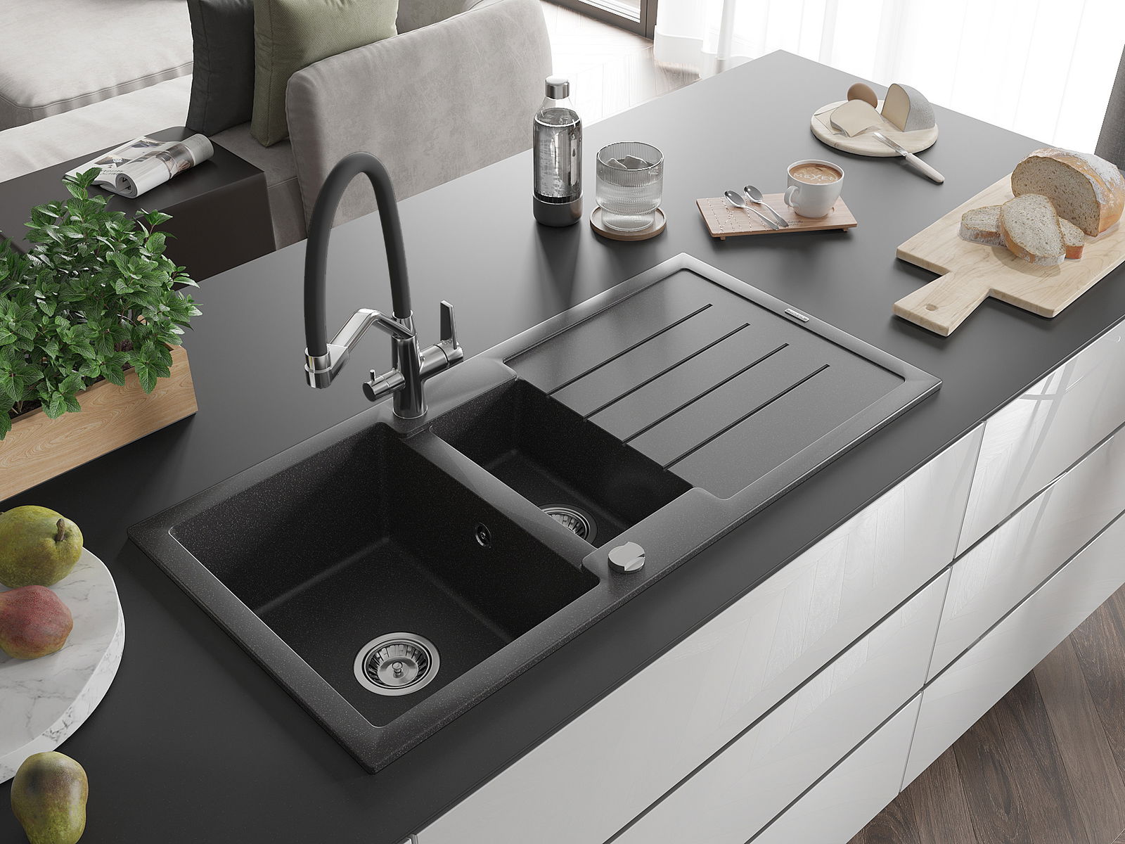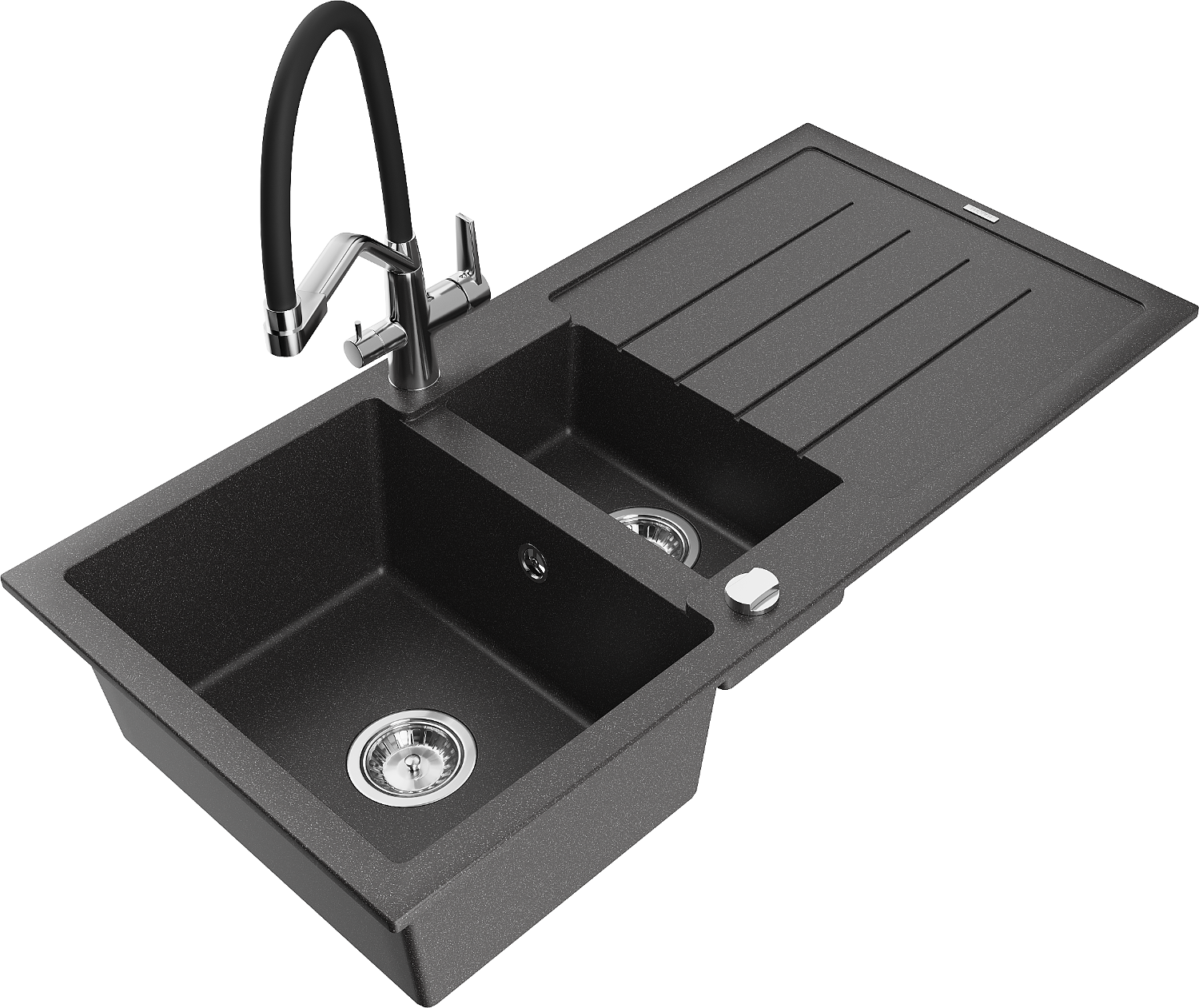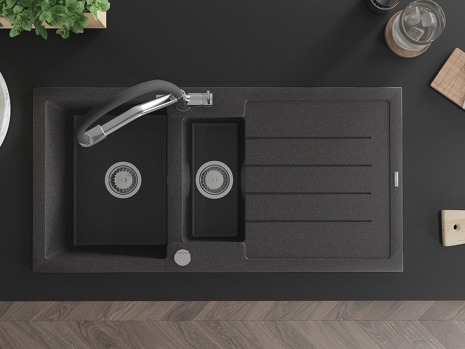 Mexen Andres 1,5 kamerų granito plautuvė su nusausintuvu ir virtuviniu maišytuvu Duo, juodos spalvos su dėmėmis