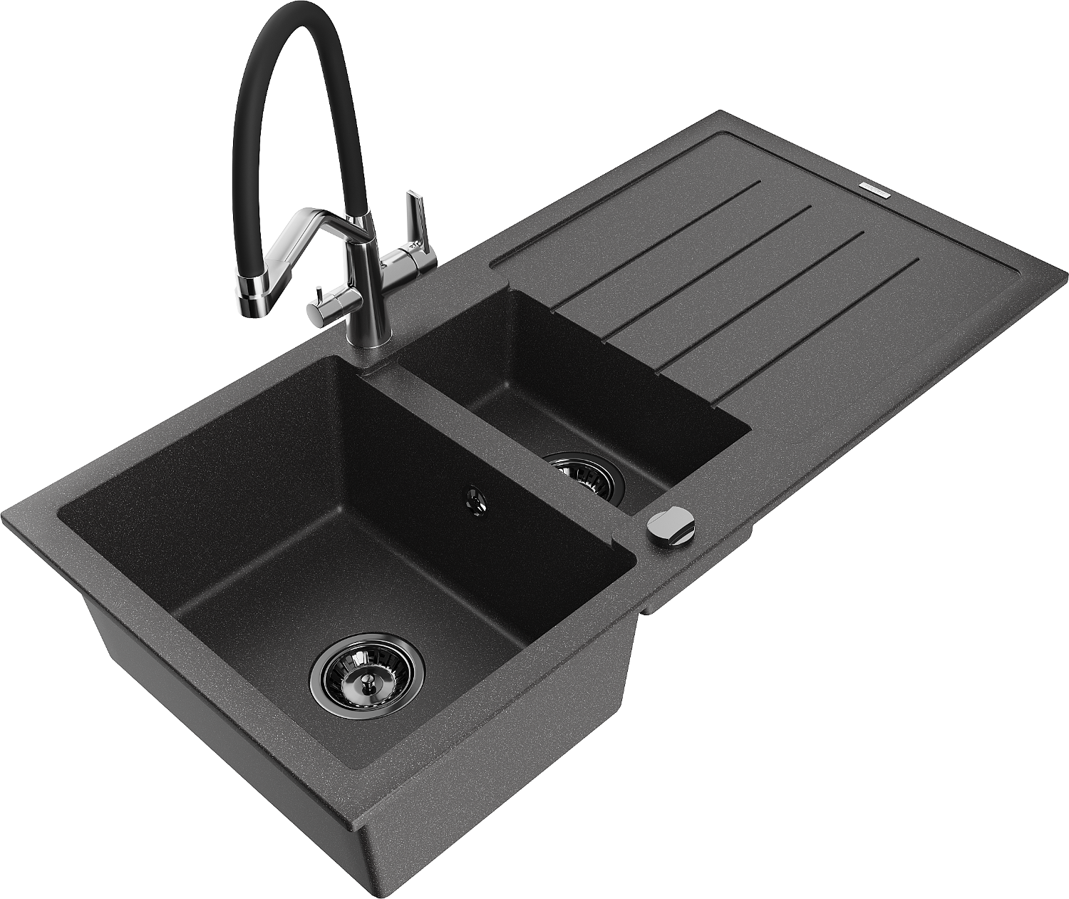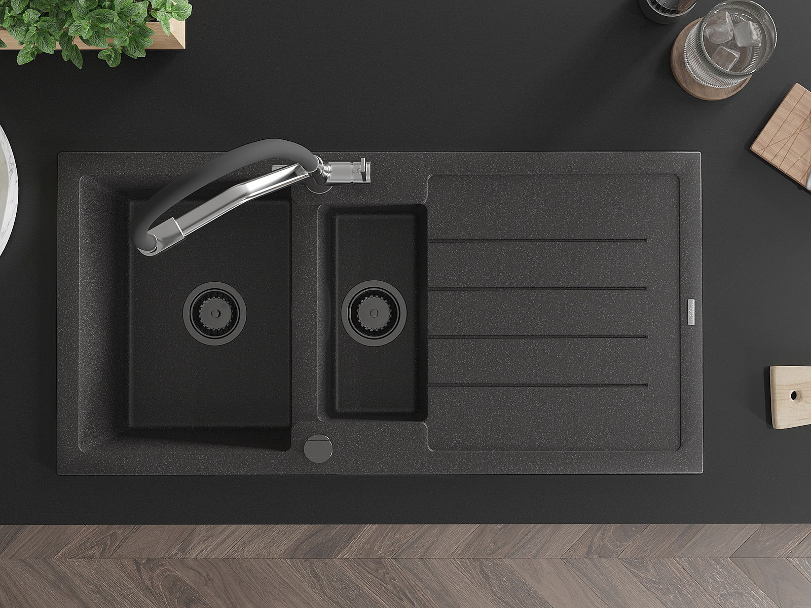 Mexen Andres granitinė kriauklė 1,5 kamerų su nusausintuvu ir virtuviniu maišytuvu Duo, juodas margas - 6515-76-671701-07-B