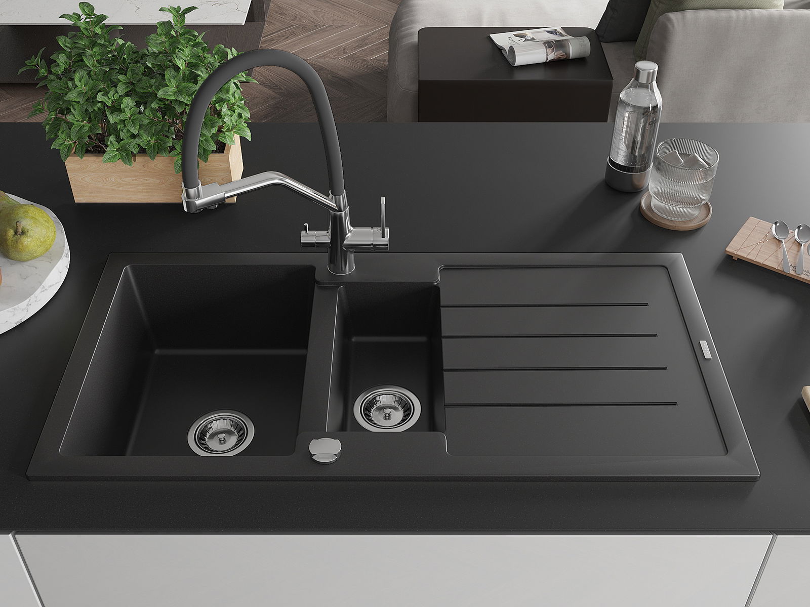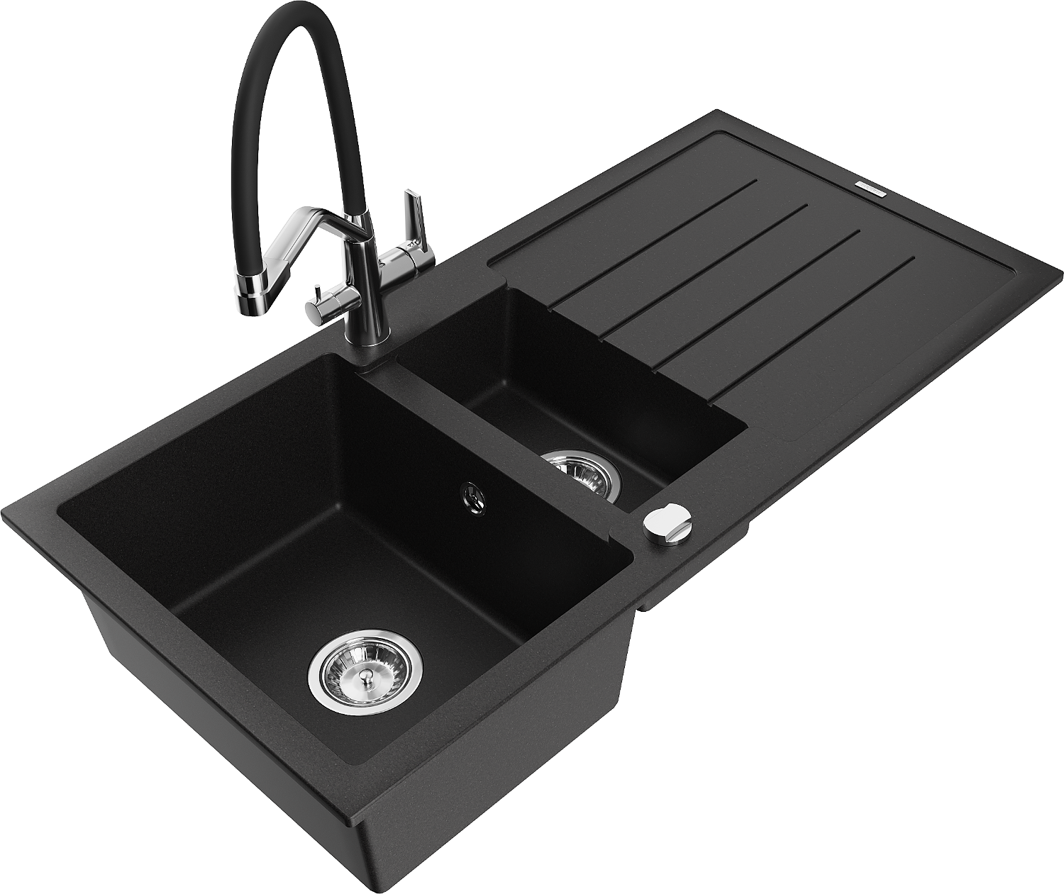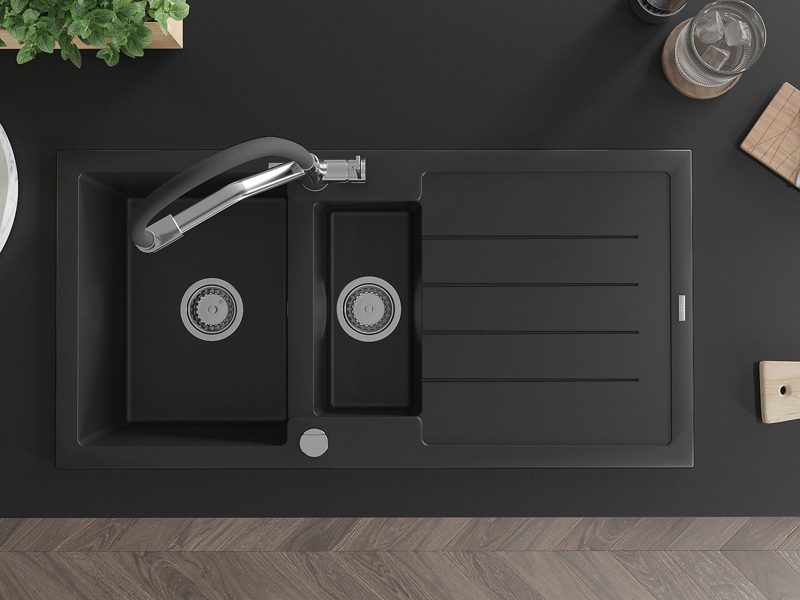 Mexen Andres granito kriauklė 1,5 skylių su nusausintuvu ir virtuviniu maišytuvu Duo, juodas - 6515-77-671701-07