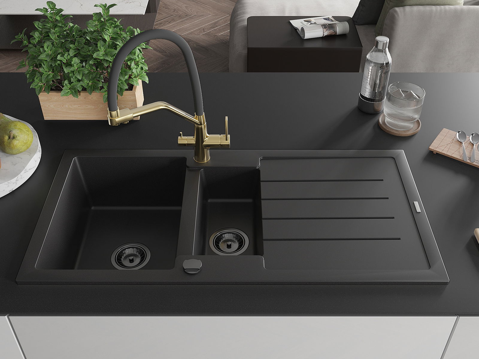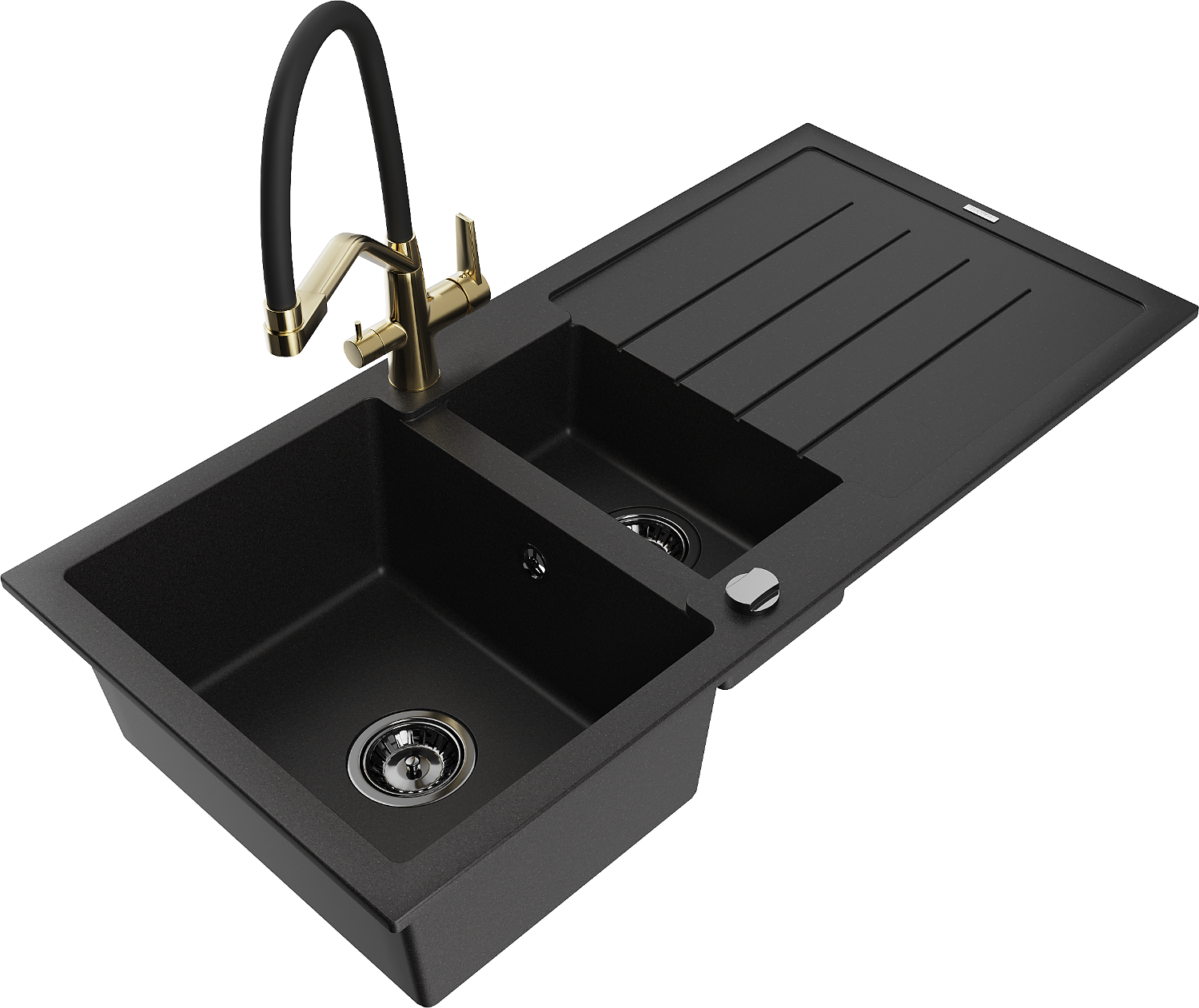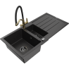 Mexen Andres granito kriauklė 1,5 skylių su nutekėjimu ir virtuvės maišytuvu Duo, juoda - 6515-77-671701-57-B