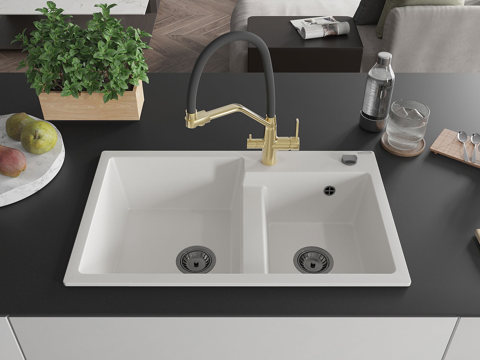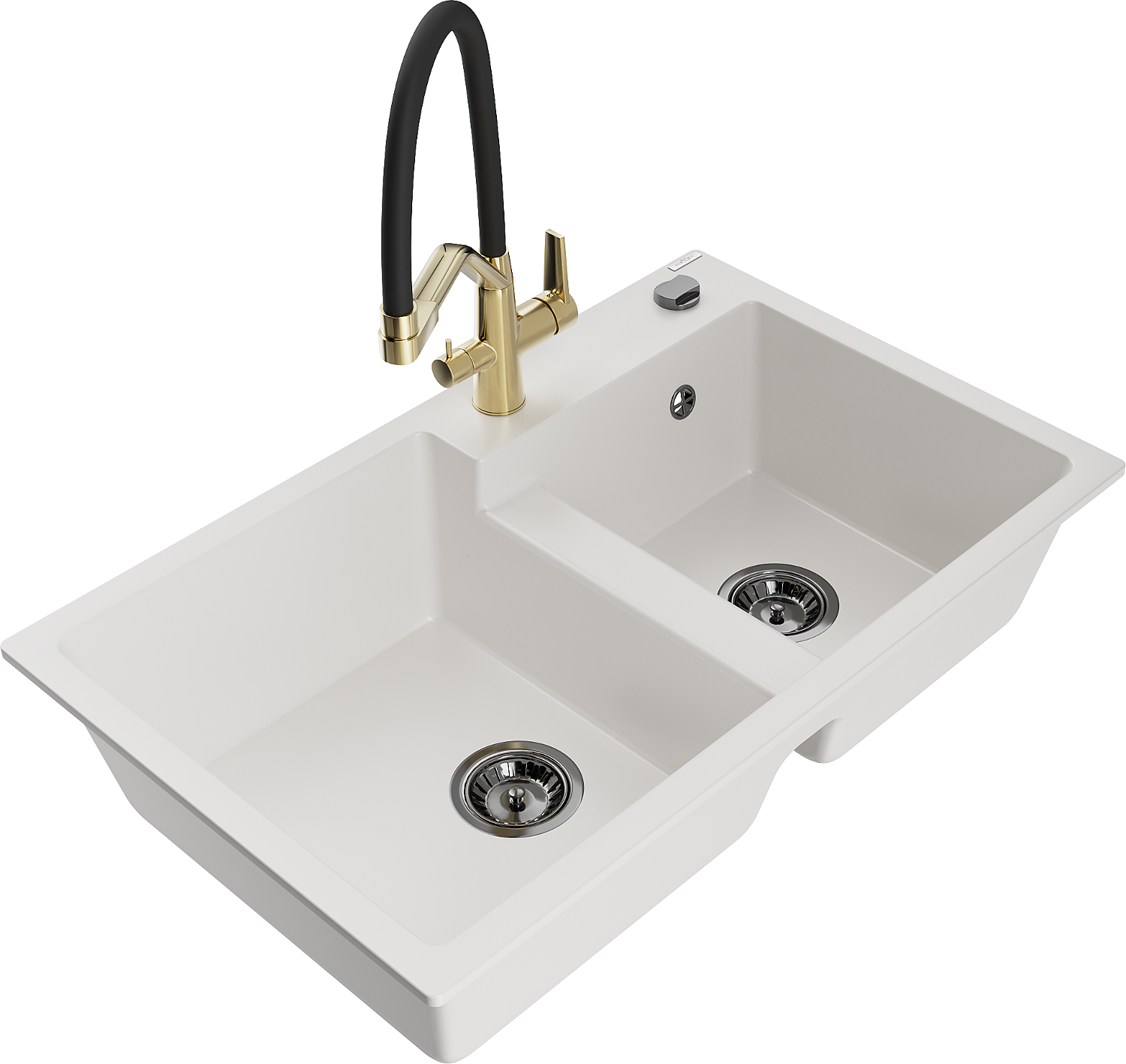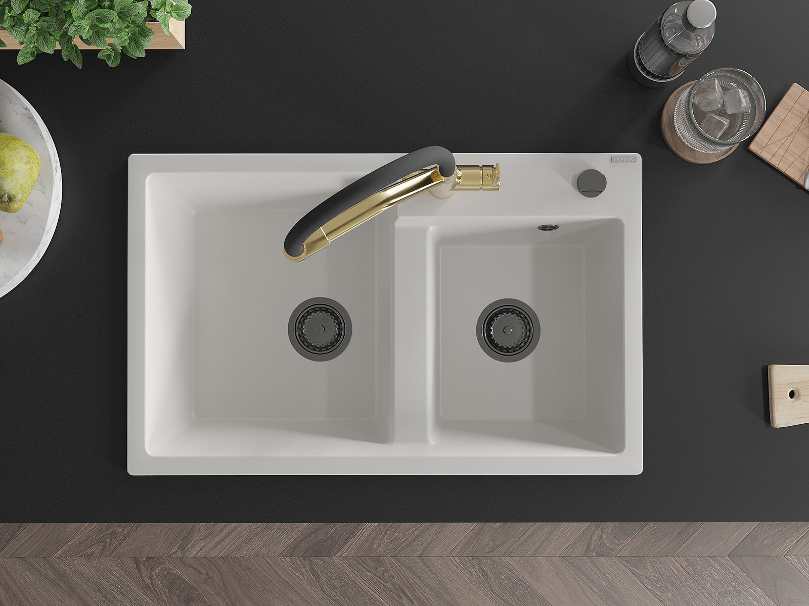 Mexen Tomas granito virtuvės kriauklė su 2 skyriais ir virtuviniu maišytuvu Duo, balta - 6516-20-671701-57-B