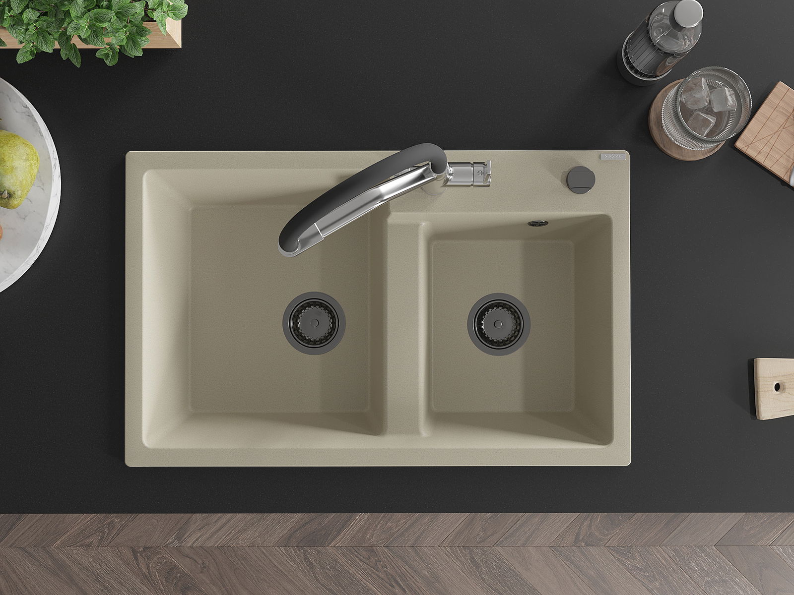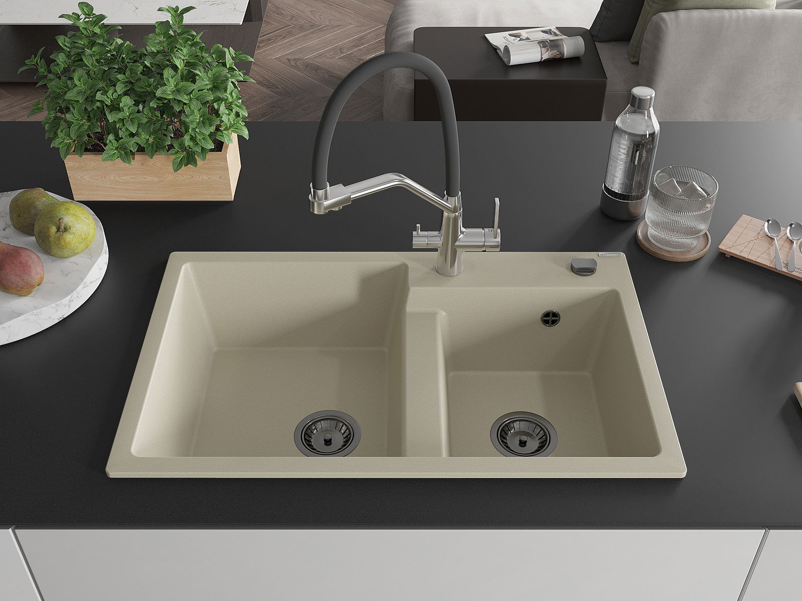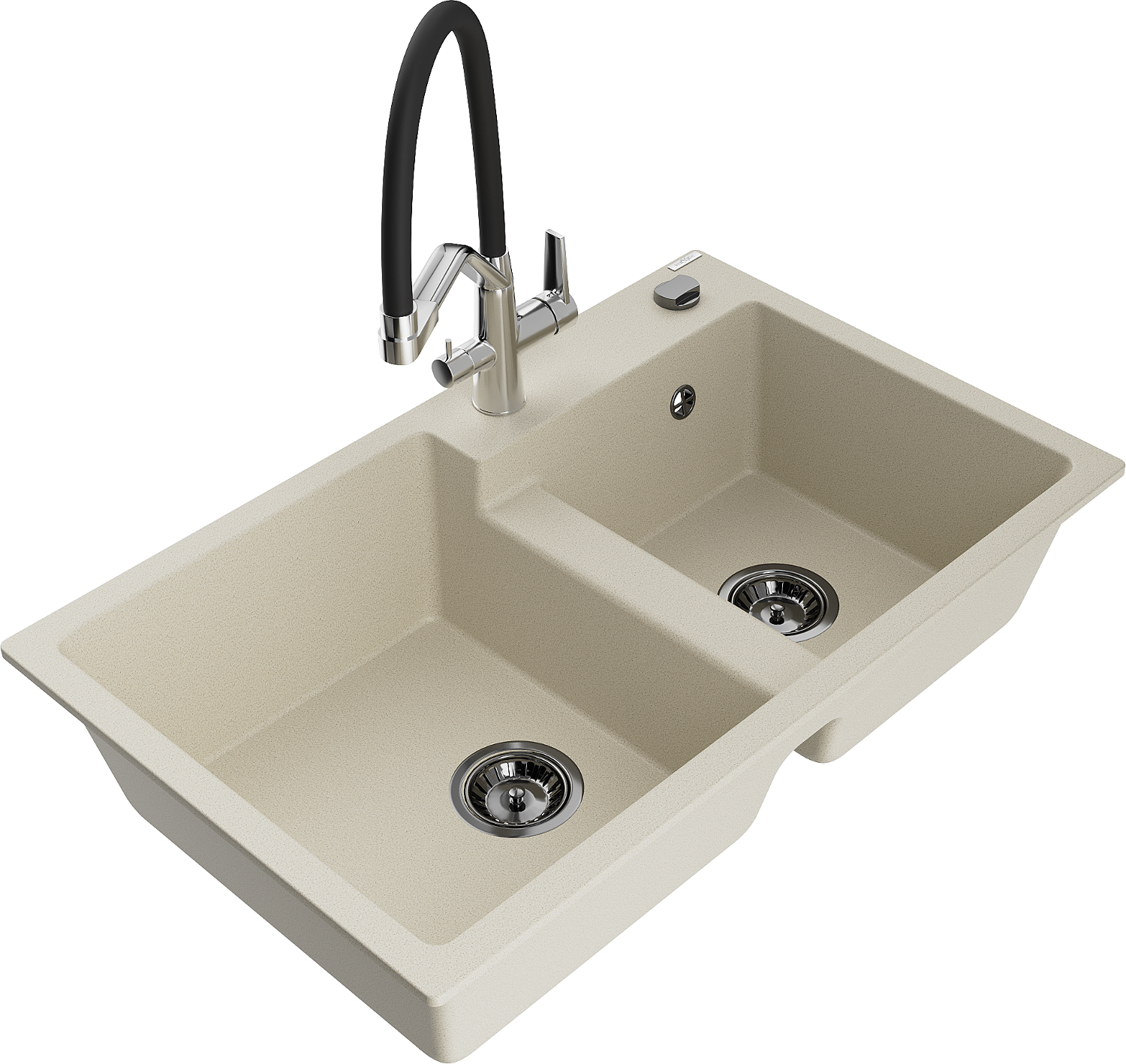 Mexen Tomas granito kriauklė su dviem dubenėliais su virtuviniu maišytuvu Duo, smėlio spalvos - 6516-69-671701-07-B