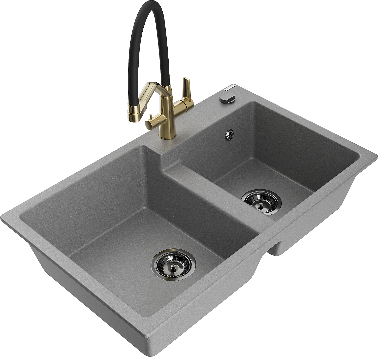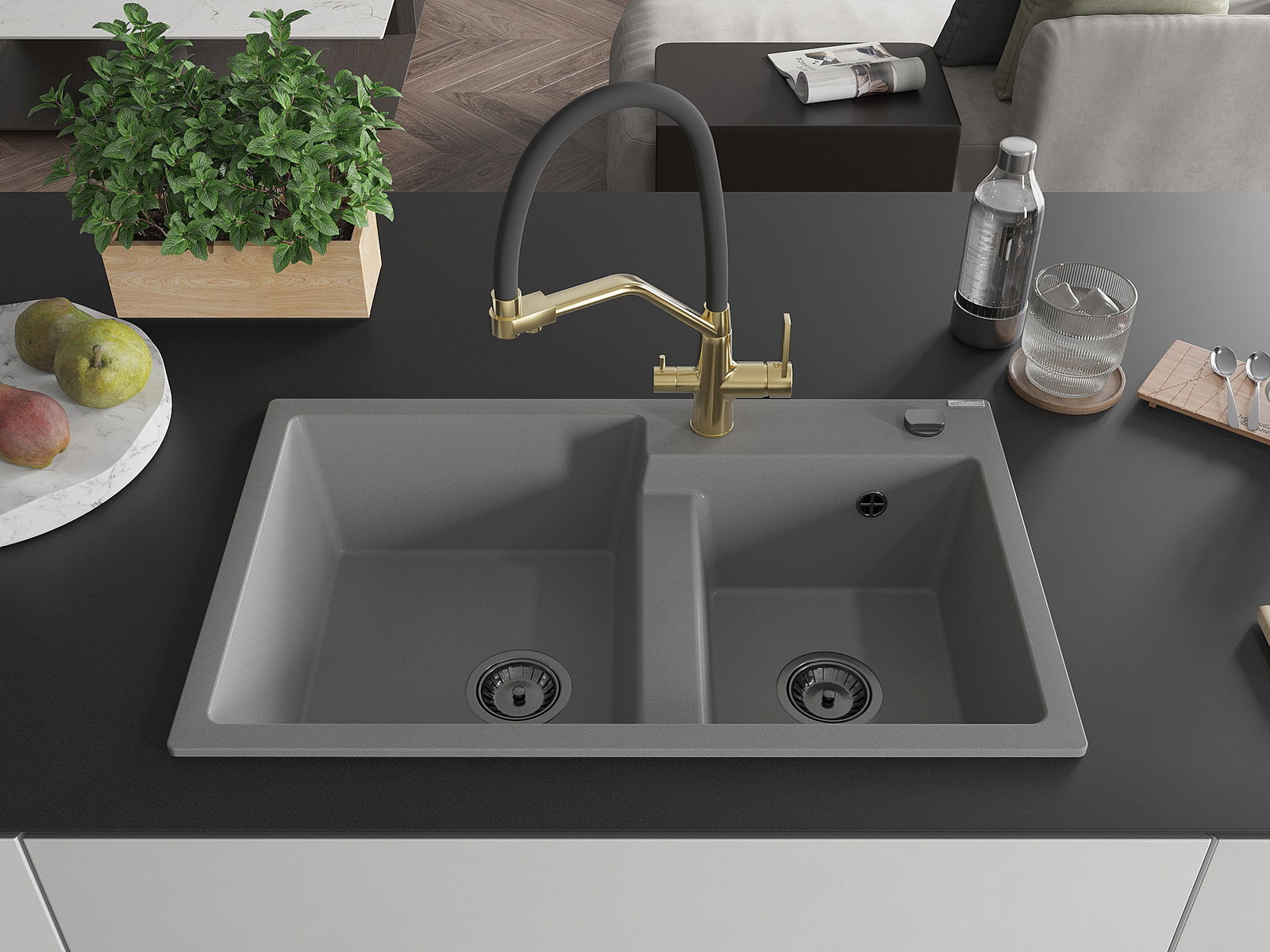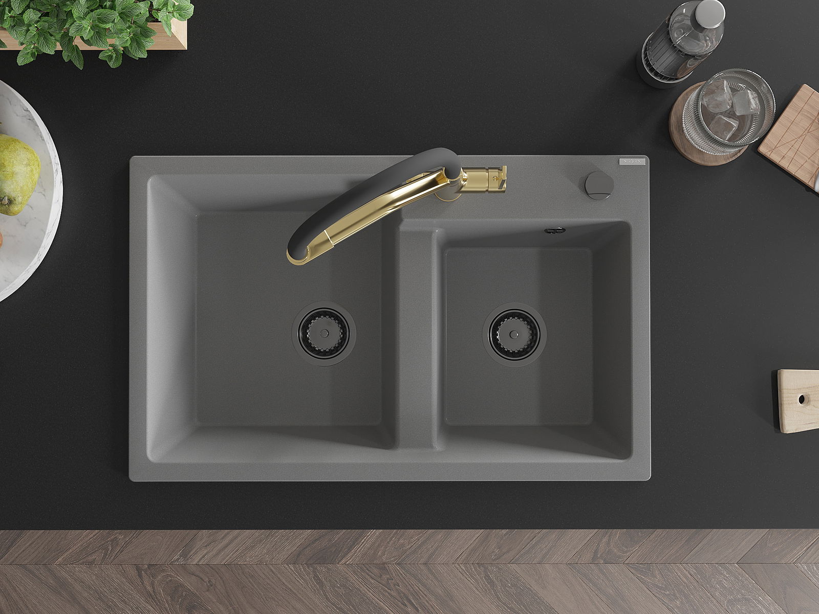 Mexen Tomas granito dviguba virtuvės plautuvė su maišytuvu Duo, pilka - 6516-71-671701-57-B