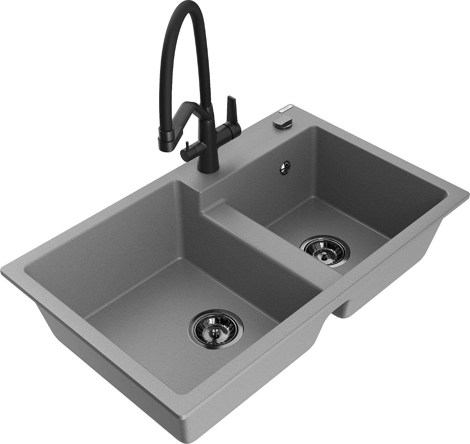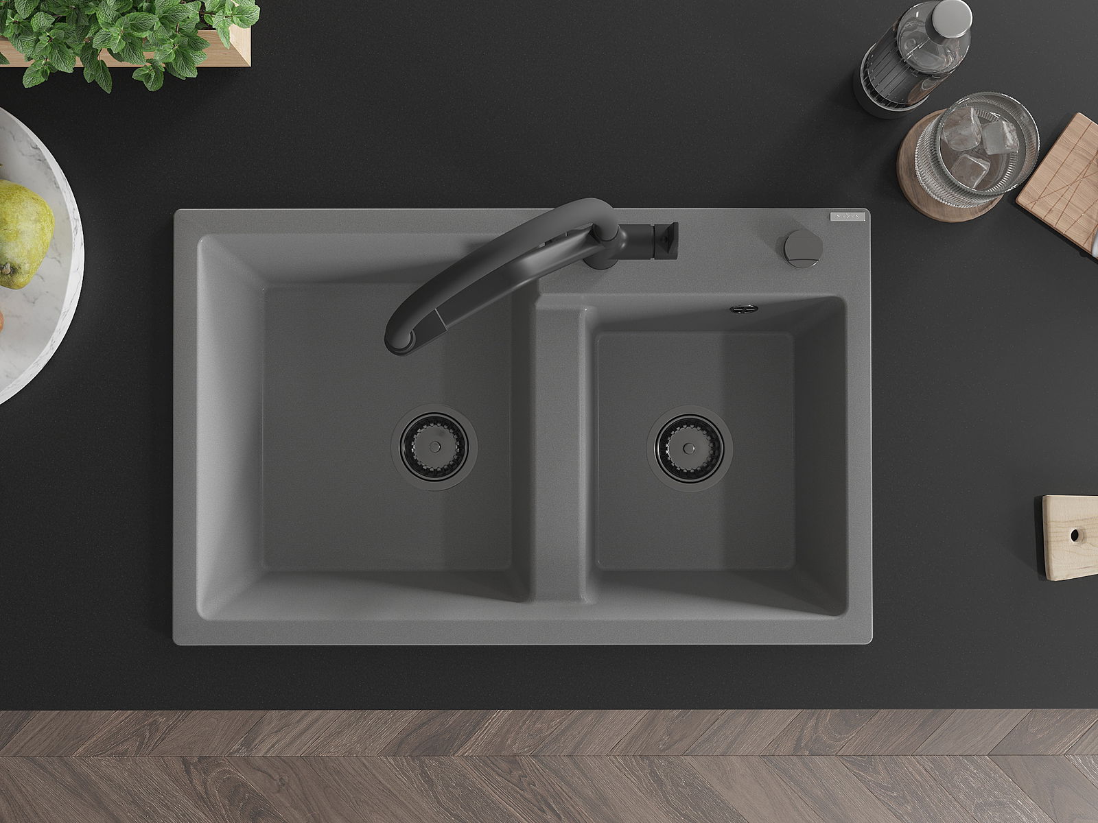 Mexen Tomas granitinė dviejų kamerų plautuvė su virtuvės Duo čiaupu, pilka - 6516-71-671701-70-B