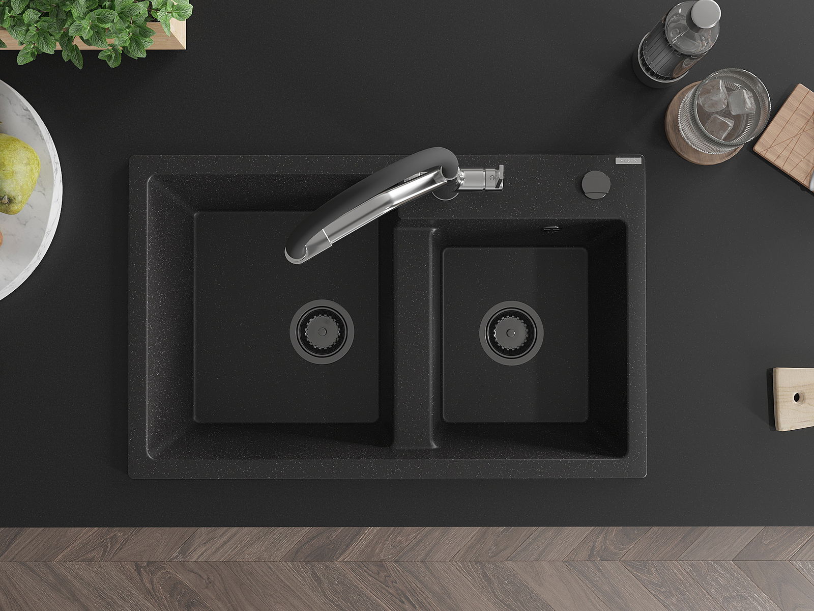 Mexen Tomas granitinė dviejų skylių kriauklė su virtuviniu maišytuvu Duo, juoda/sidabras metaliko - 6516-73-671701-07-B
