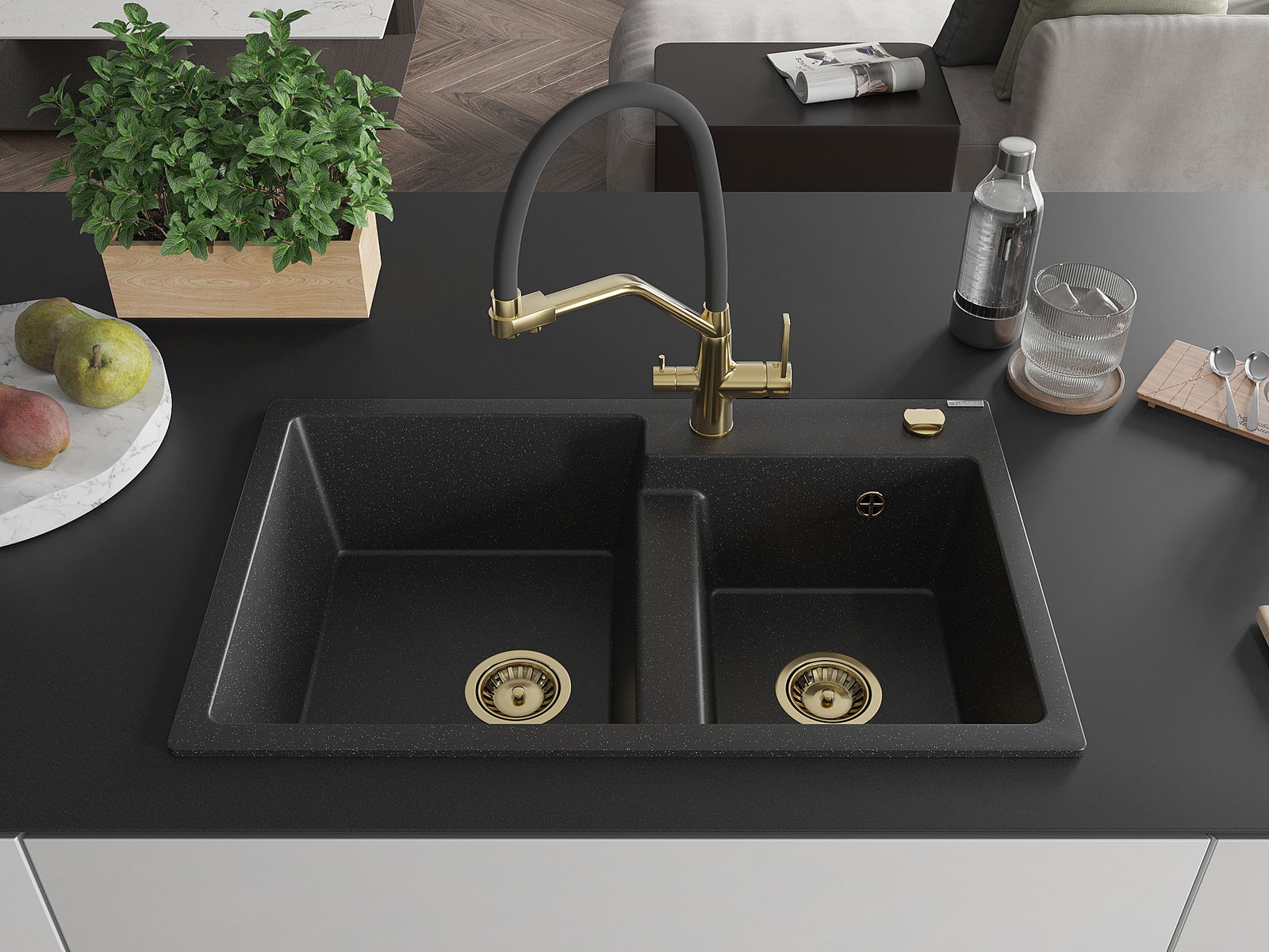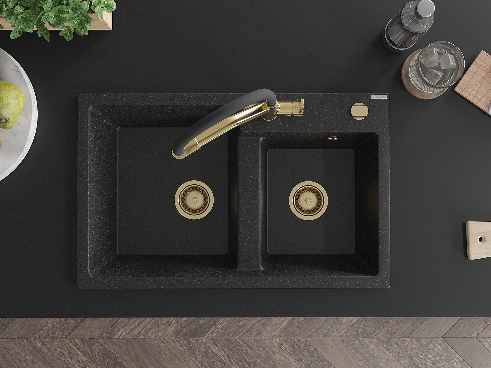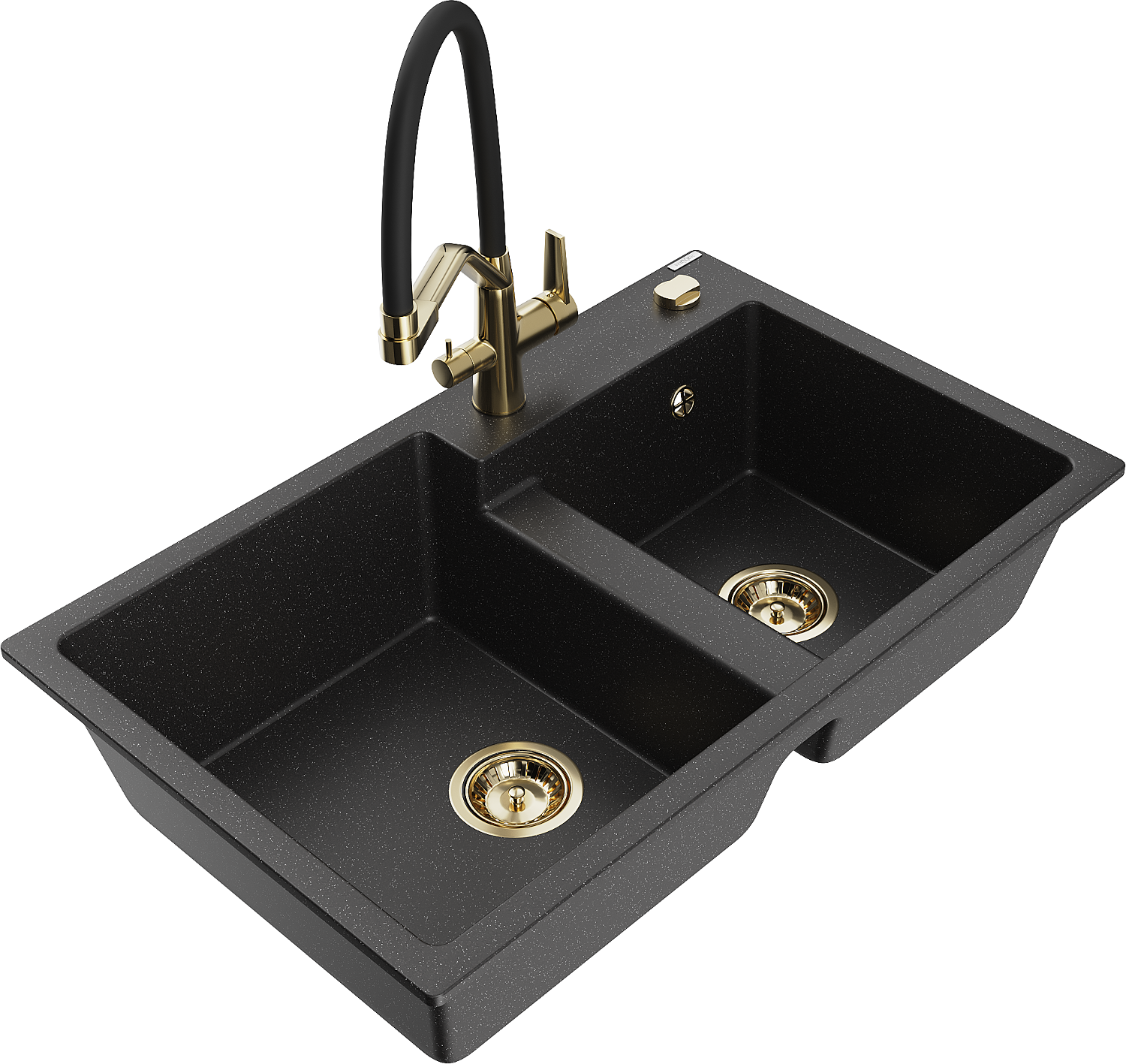 Mexen Tomas granitinis dviejų skyrių plautuvė su Duo virtuviniu maišytuvu, juodas/sidabrinis metalikas - 6516-73-671701-57-G