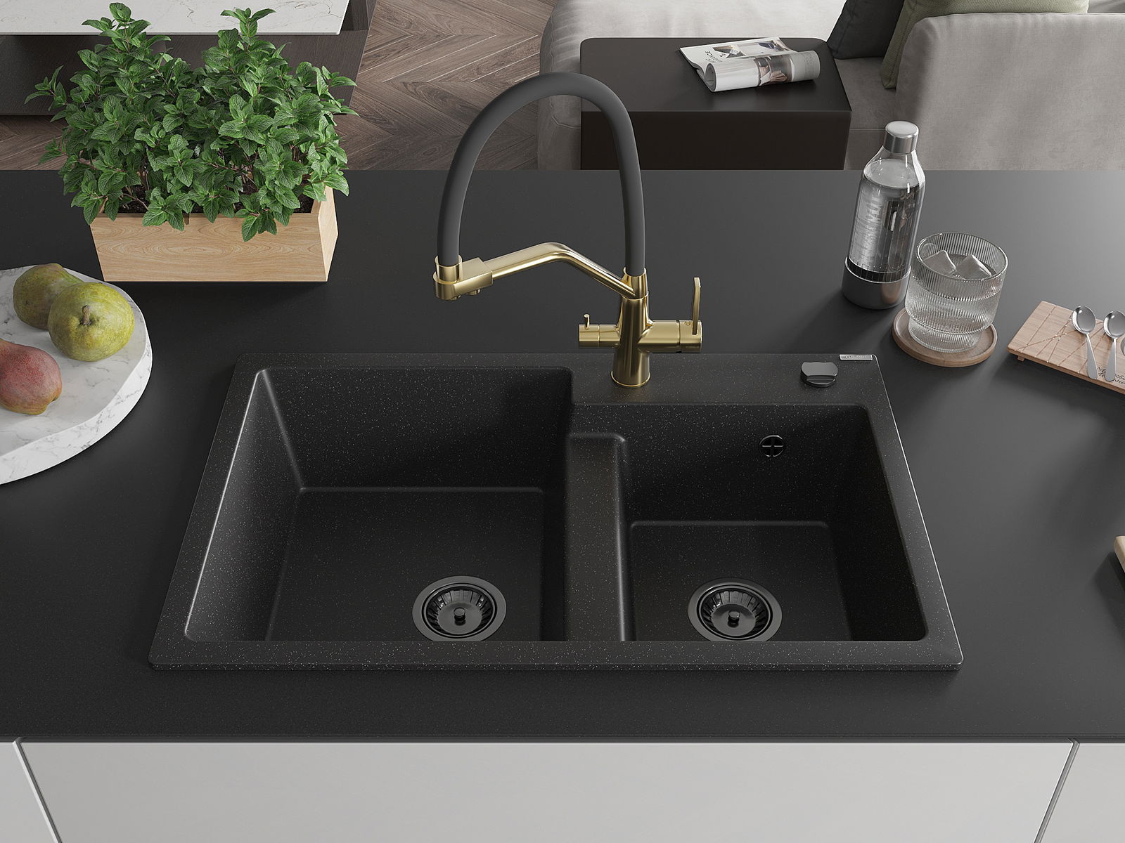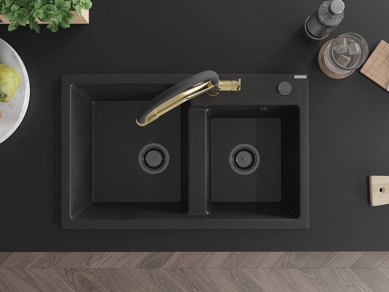 Mexen Tomas dviejų kamerų granito kriauklė su virtuvės maišytuvu Duo, juodas/sidabro metalikas - 6516-73-671701-57-B