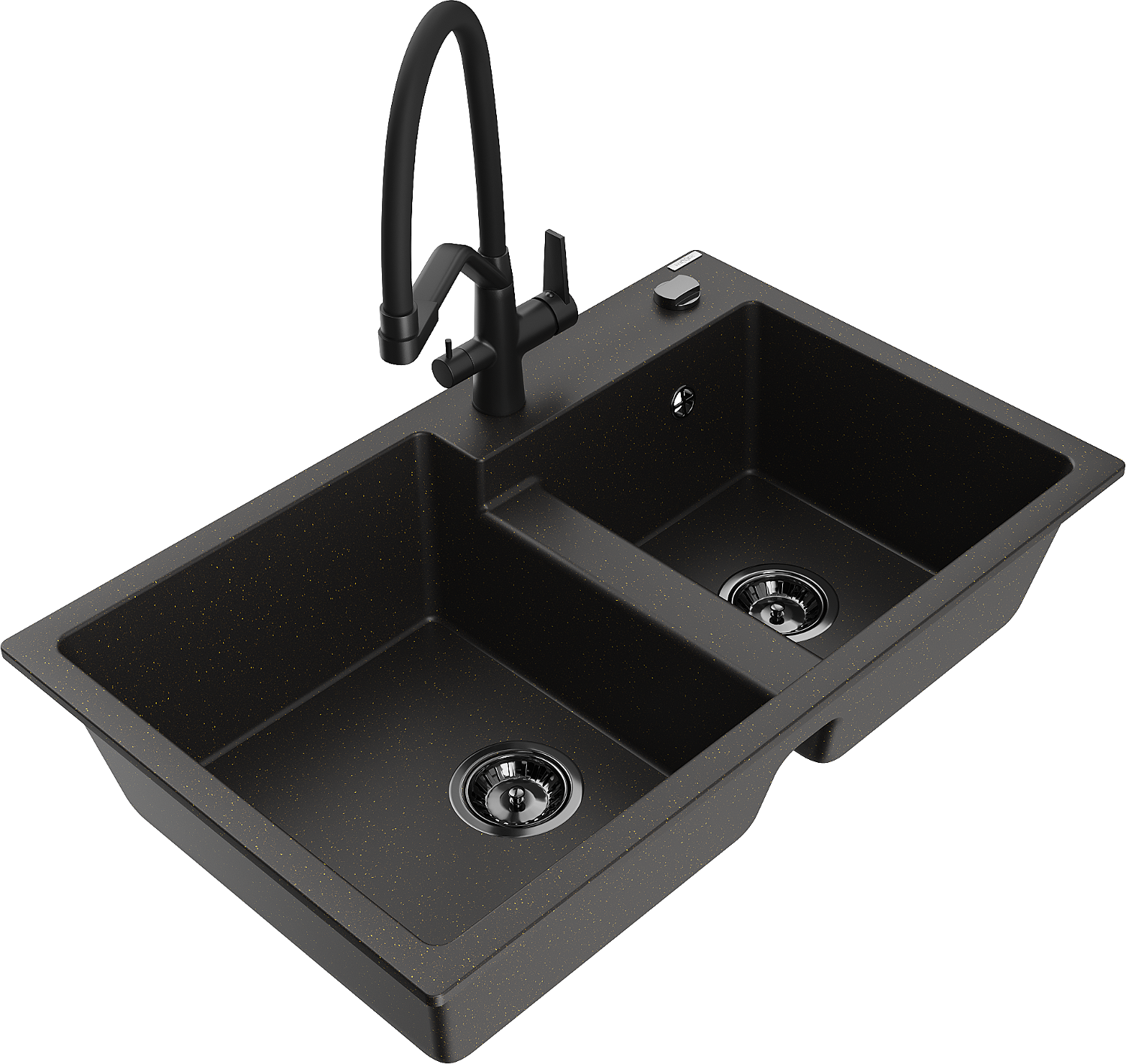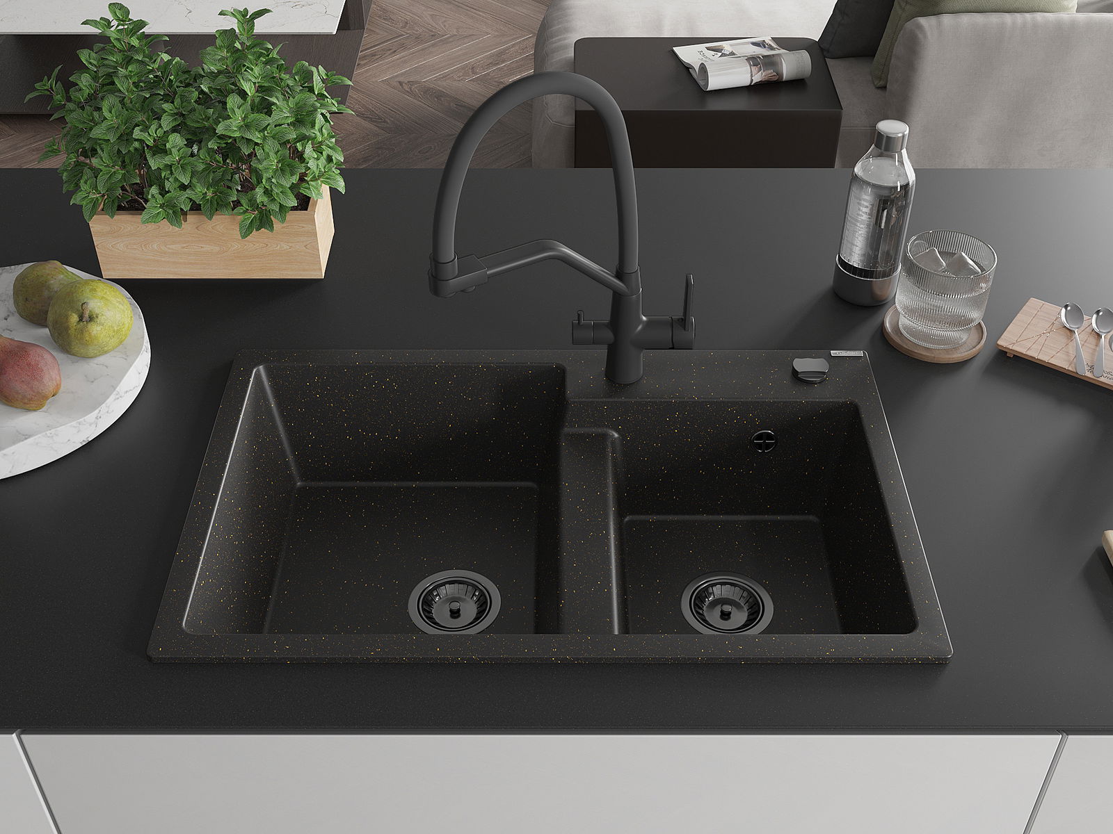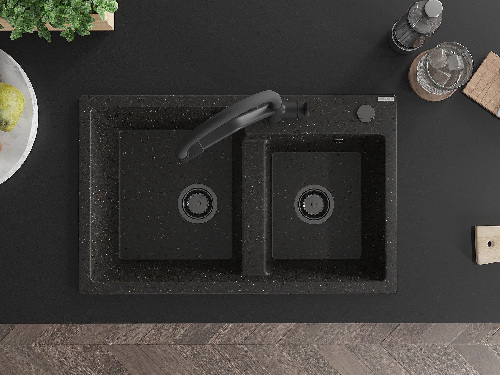 Mexen Tomas granitinė dviejų skyrių plautuvė su virtuviniu maišytuvu Duo, juoda/aukso metalo spalva - 6516-75-671701-70-B