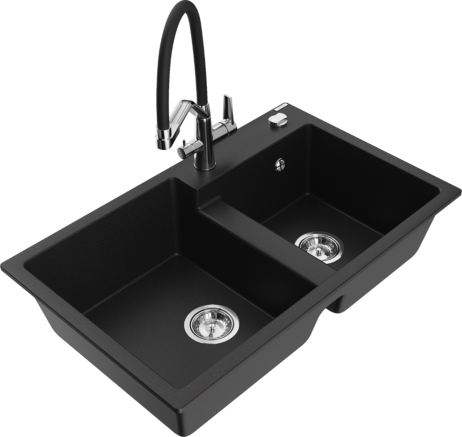 Mexen Tomas dviejų skylių granito kriauklė su virtuviniu maišytuvu Duo, juoda - 6516-77-671701-07