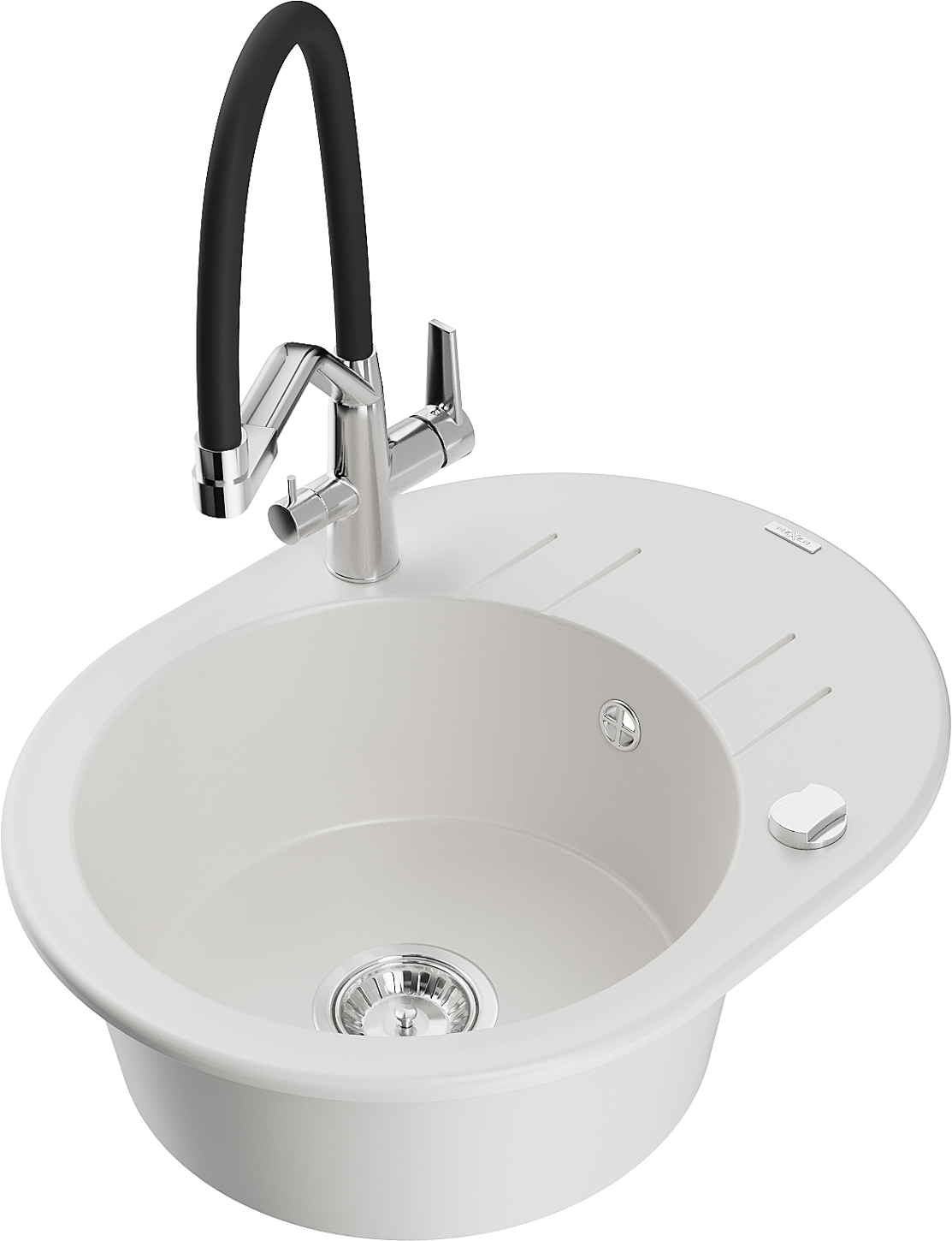 Mexen Kevin granito virtuvinė kriauklė su viena kamera ir virtuviniu maišytuvu Duo, balta - 6517-20-671701-07