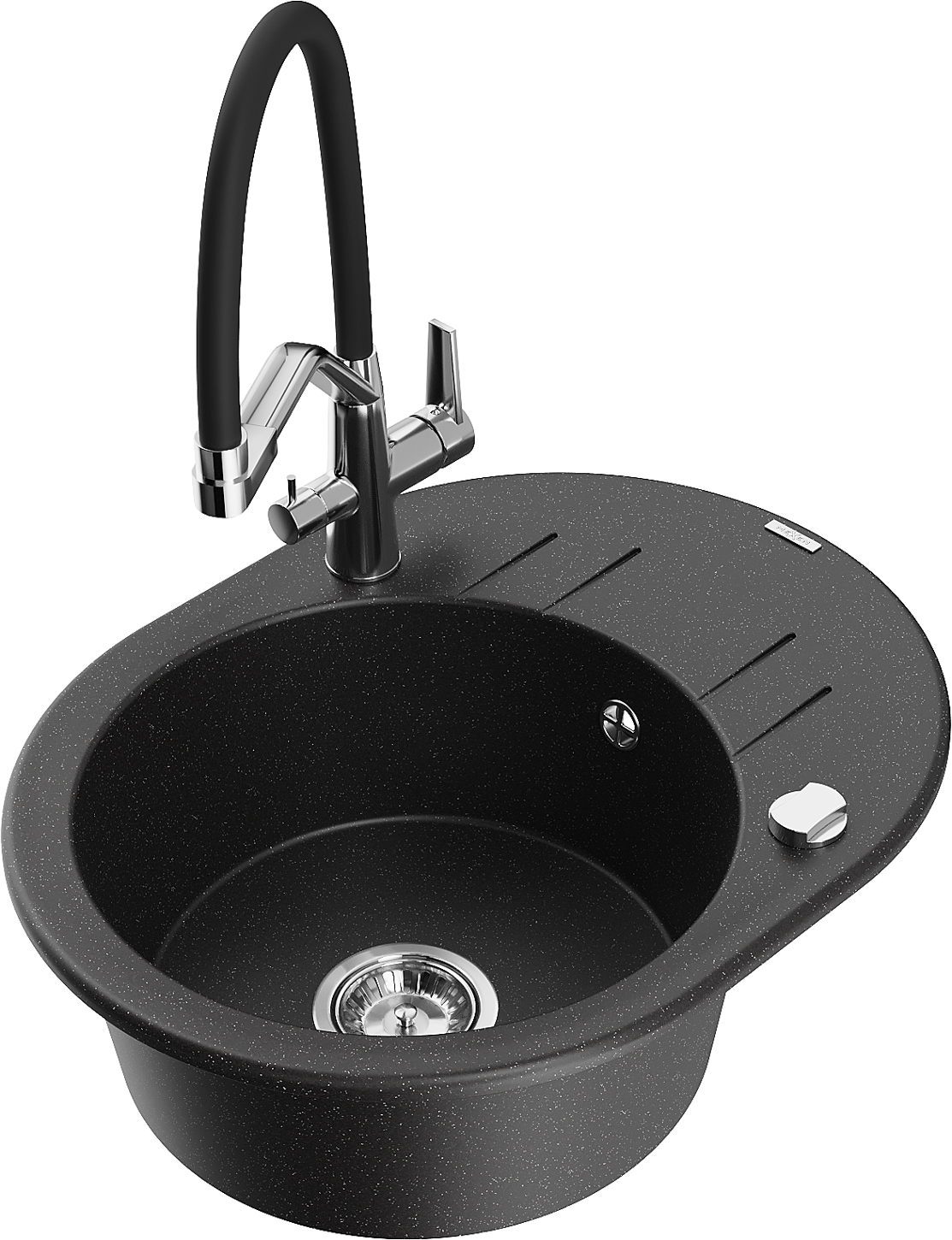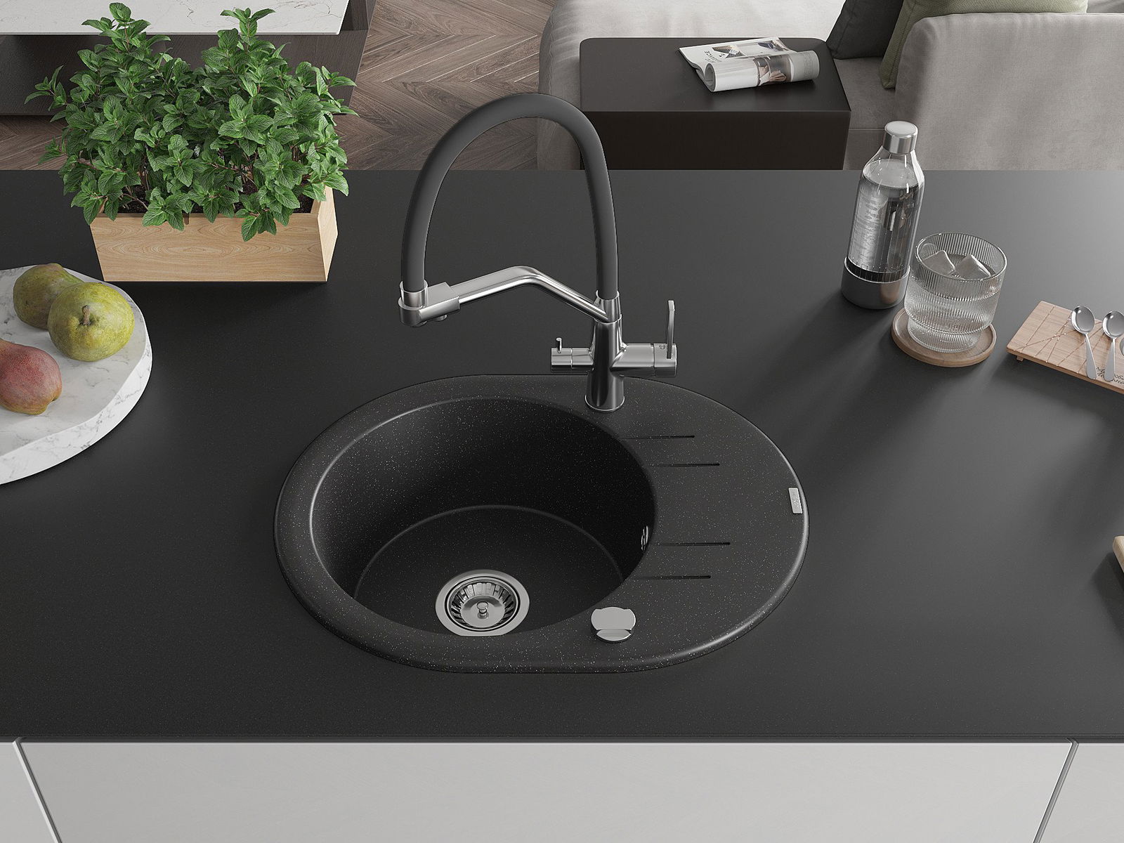 Mexen Kevin granito plautuvė 1-kamerinė su virtuviniu maišytuvu Duo, juoda/sidabro metalo spalvos - 6517-73-671701-07