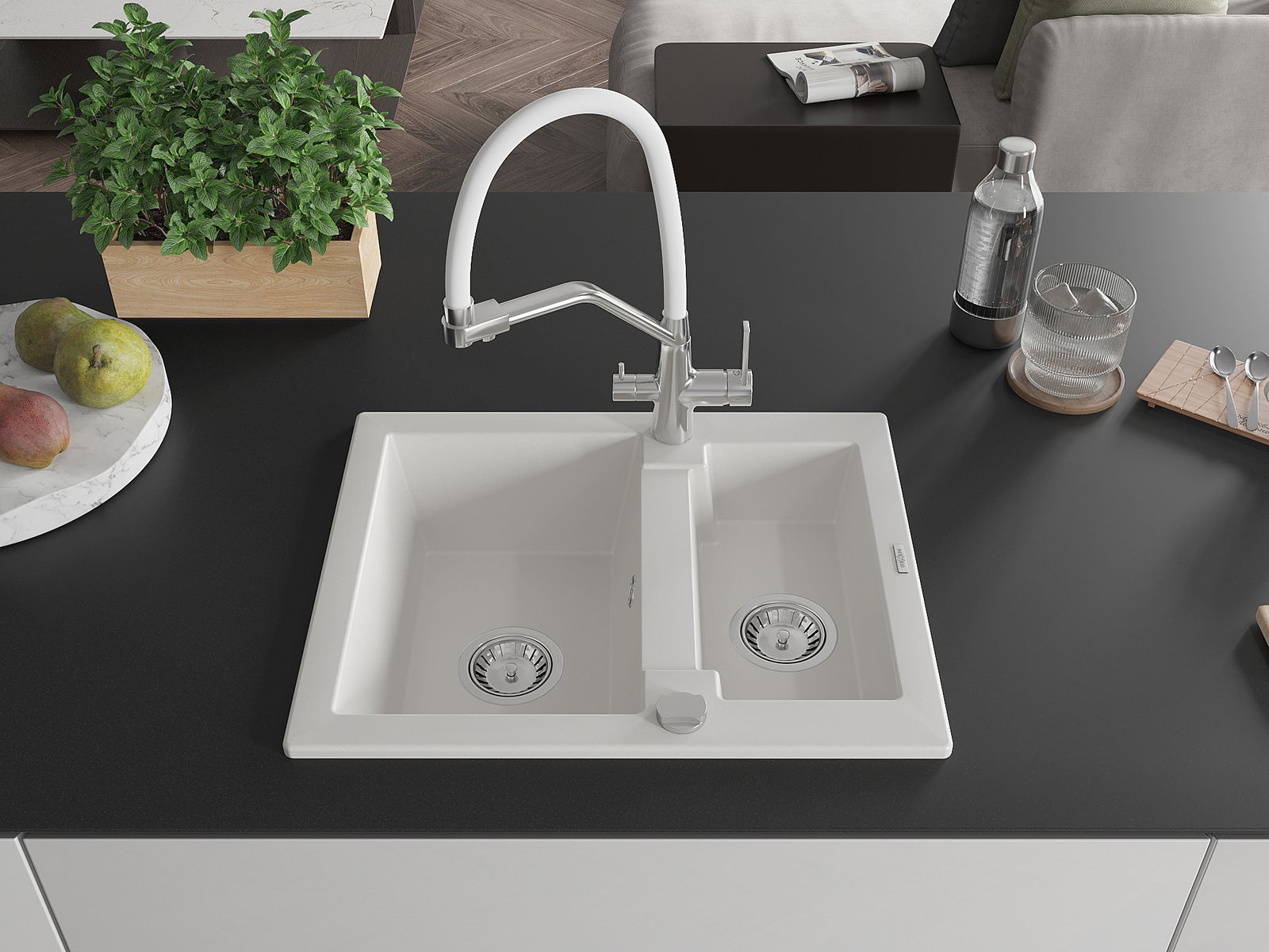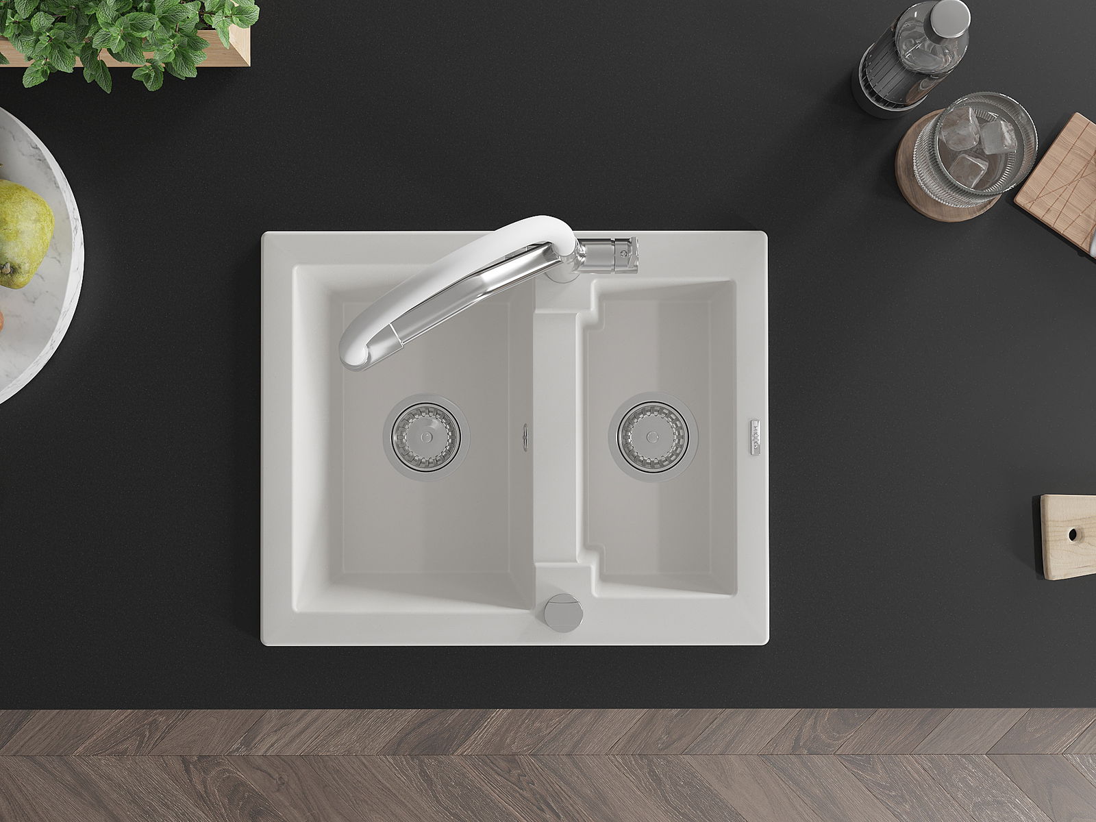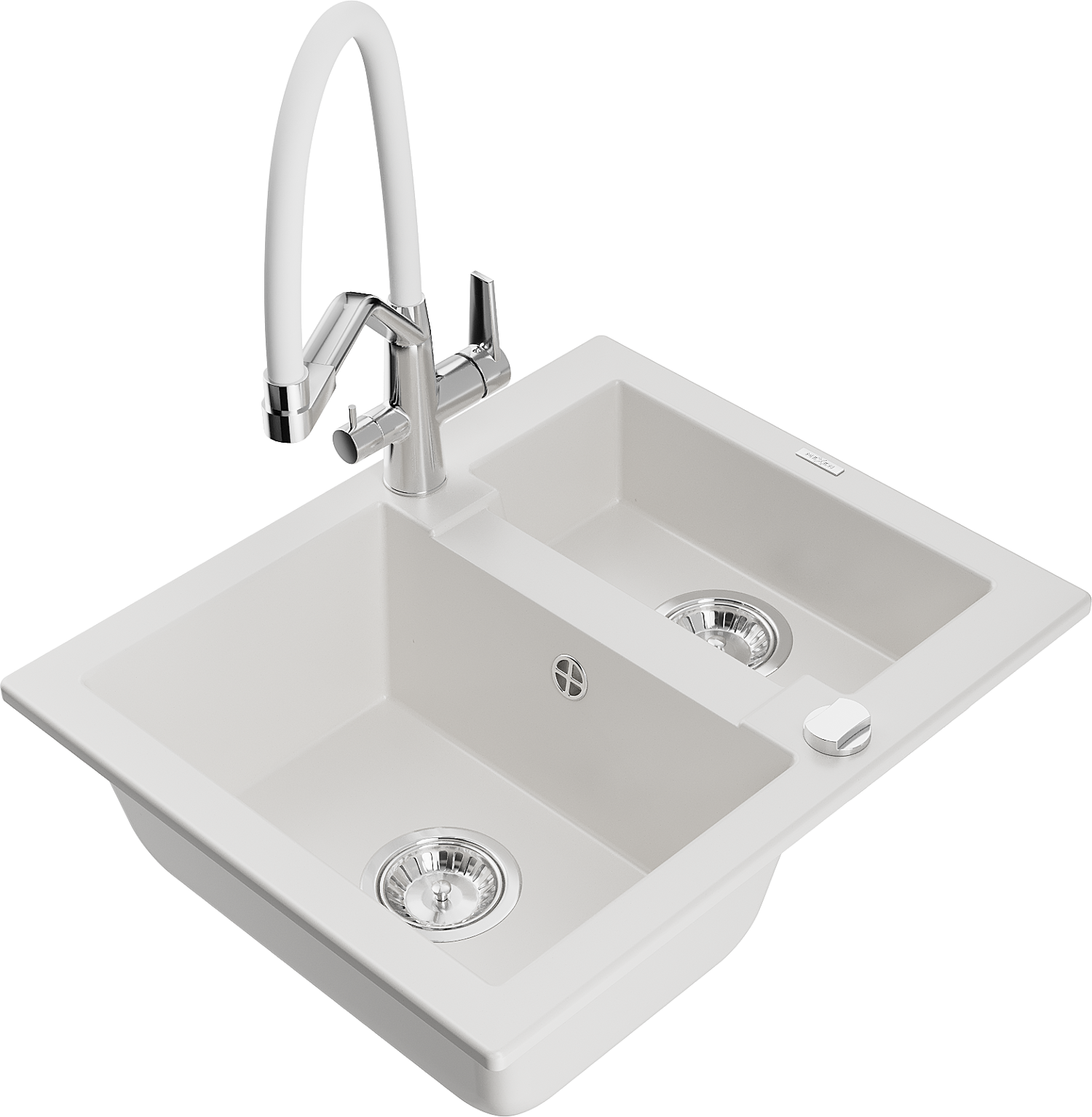 Mexen Carlos akmens masės plautuvė 1,5- skylių su Duo virtuvine maišykle, balta - 6518-20-671701-02