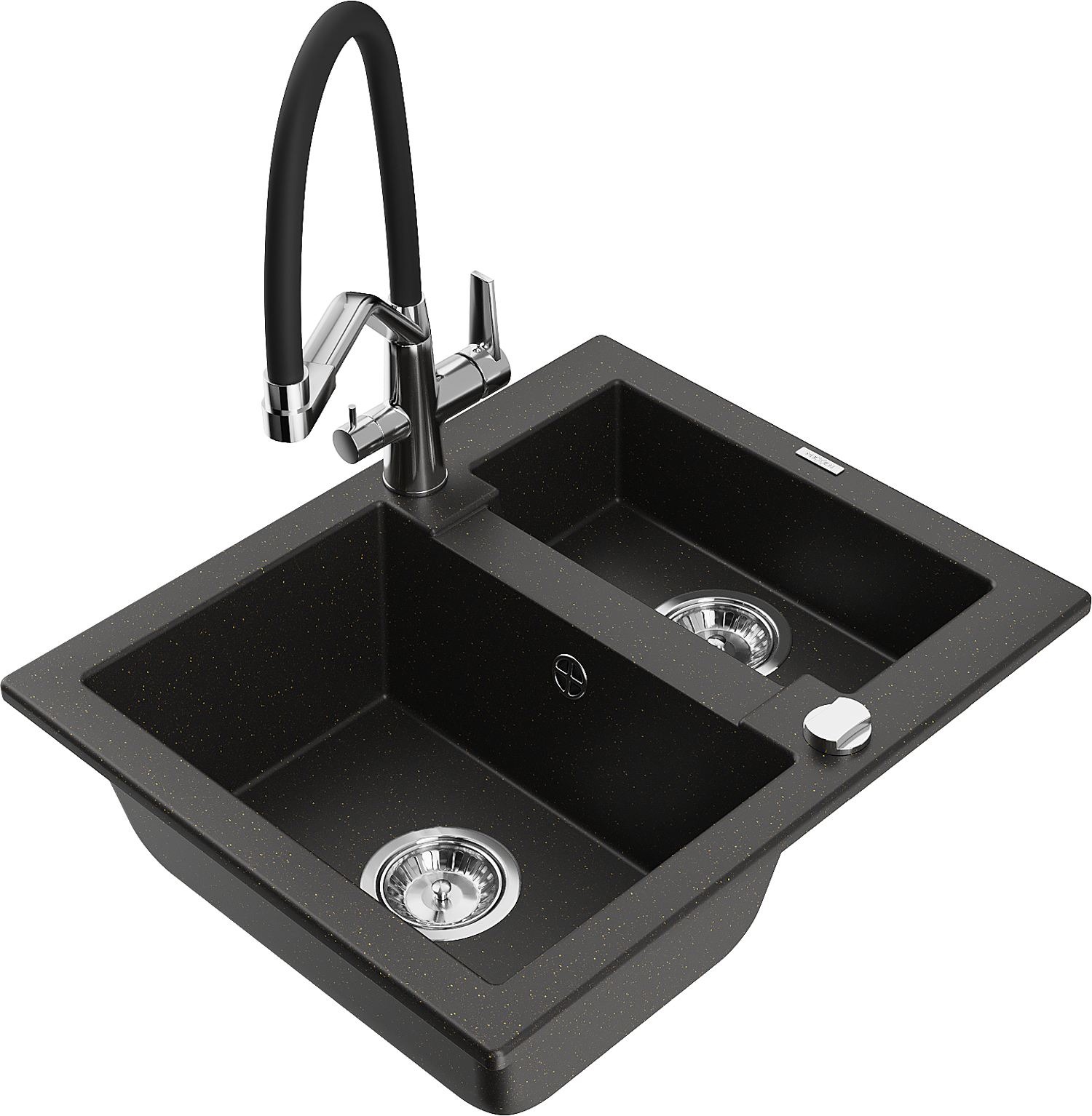 Mexen Carlos granito plautuvė 1,5 skylių su virtuviniu čiaupu Duo, juoda/auksinė metalika - 6518-75-671701-07