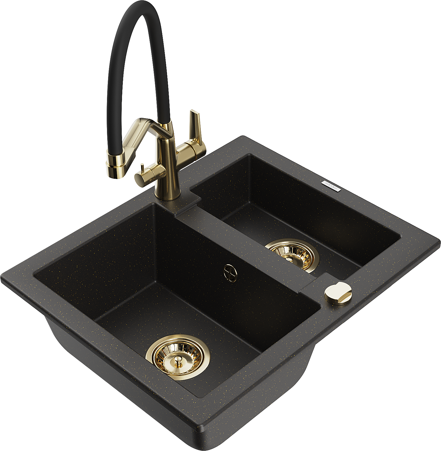 Mexen Carlos granitinė 1,5 skyrių kriauklė su Duo maišytuvu, juoda/auksinė metalika - 6518-75-671701-57-G