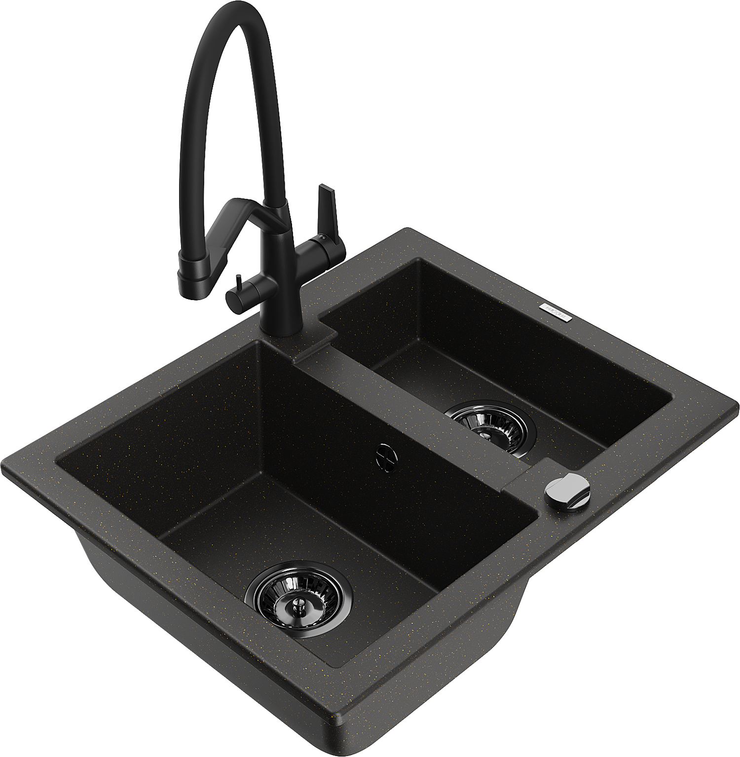 Mexen Carlos granito plautuvė 1,5 skyrių su virtuviniu maišytuvu Duo, juodas/auksinis metalikas - 6518-75-671701-70-B