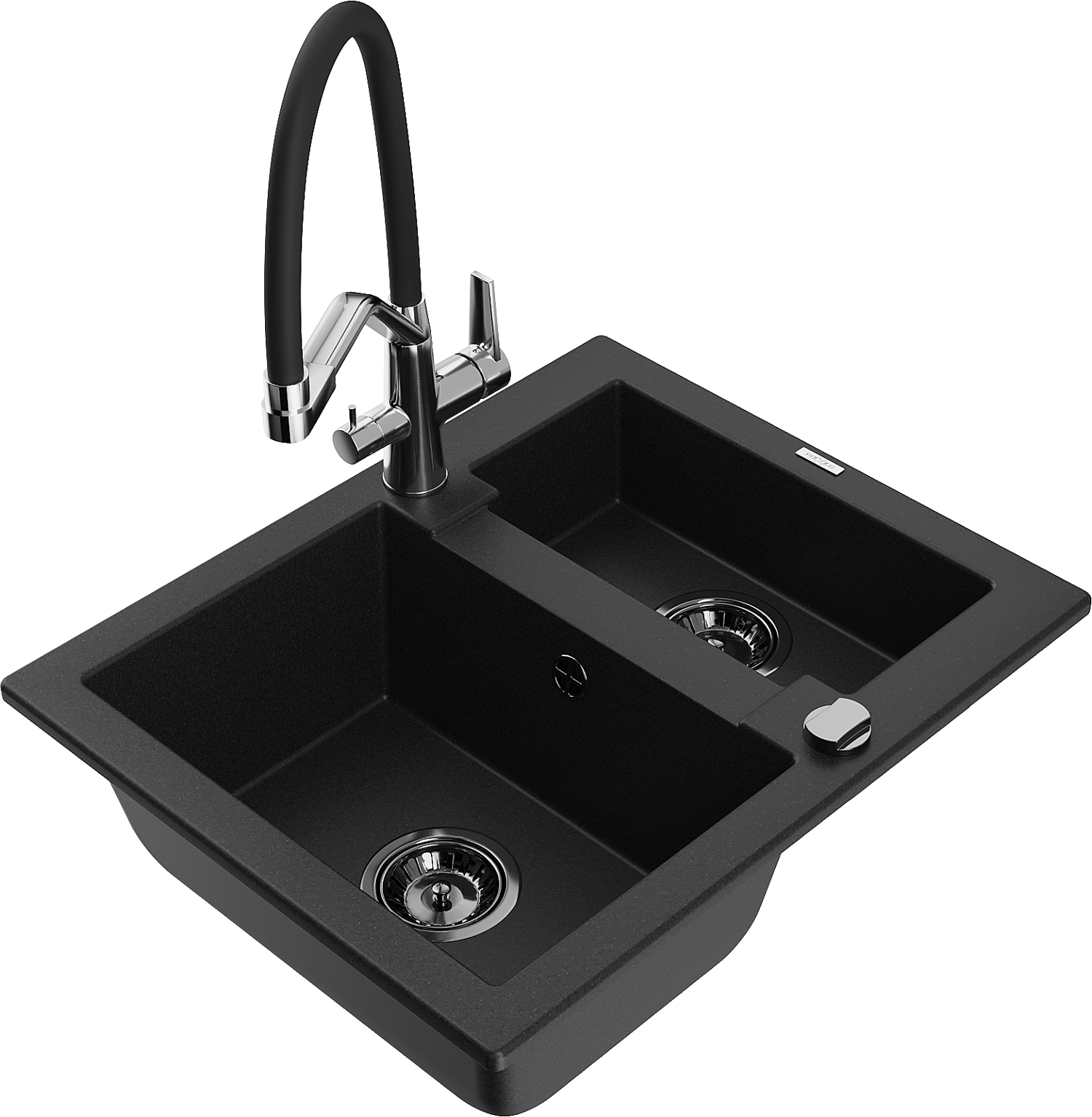 Mexen Carlos granitinė 1,5-dubenų plautuvė su Duo virtuviniu maišytuvu, juodas - 6518-77-671701-07-B