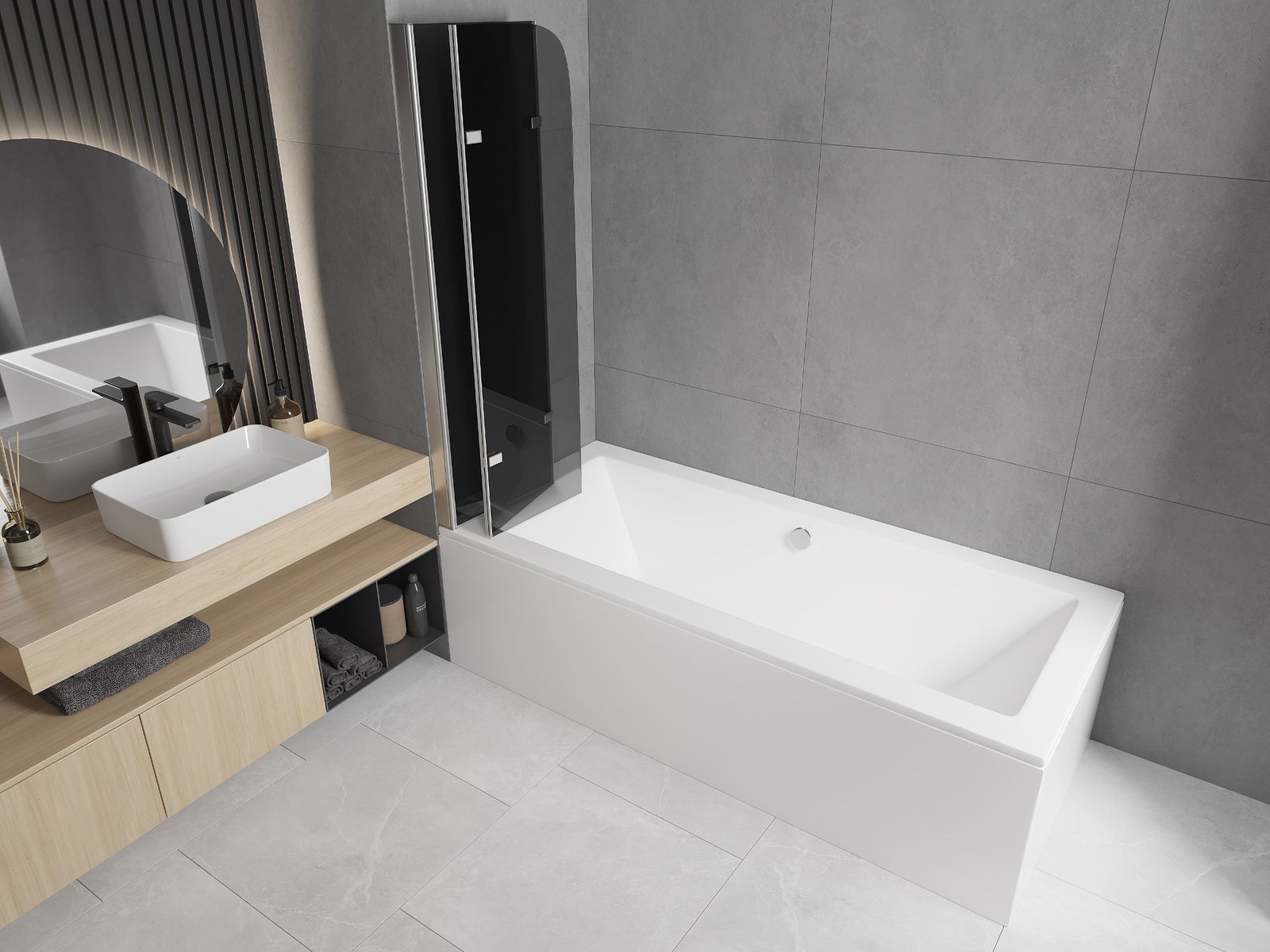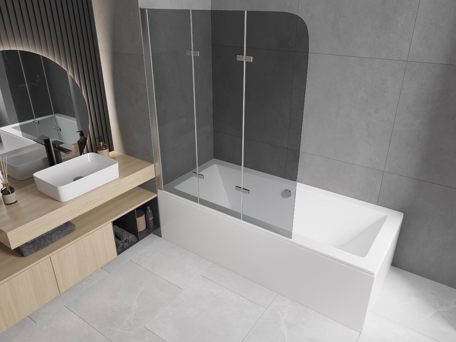 Ekranas pagamintas iš trijų sparnų, turinčių sulankstymo galimybę. Šis sprendimas taupo daugiau vietos vonios kambaryje ir leidžia laisvai naudoti likusią erdvę, kai nenaudojame maudymosi vietos.