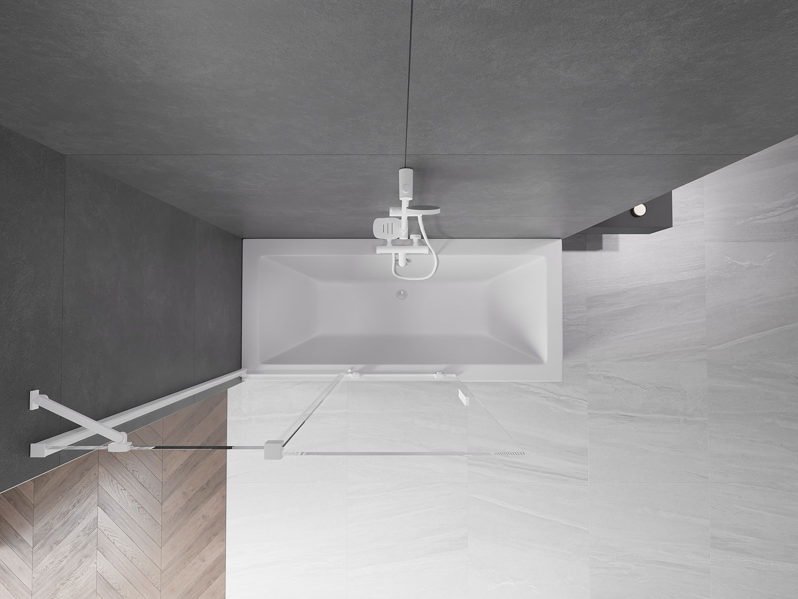 Veiksminga apsauga nuo vandens išsiliejimo maudymosi metu. Ekrane yra antspaudai, kurie puikiai prisitaiko prie stiklo stiklo ir vonios krašto. Funkcinis sprendimas, užtikrinantis saugumą ir lengvą priežiūrą.