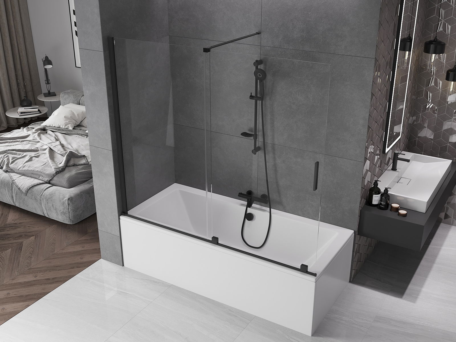 Mexen Velar 2-jų dalių slankiojantis vonios pertvaras 180 x 150 cm, skaidrus, juodas - 896-180-000-01-70
