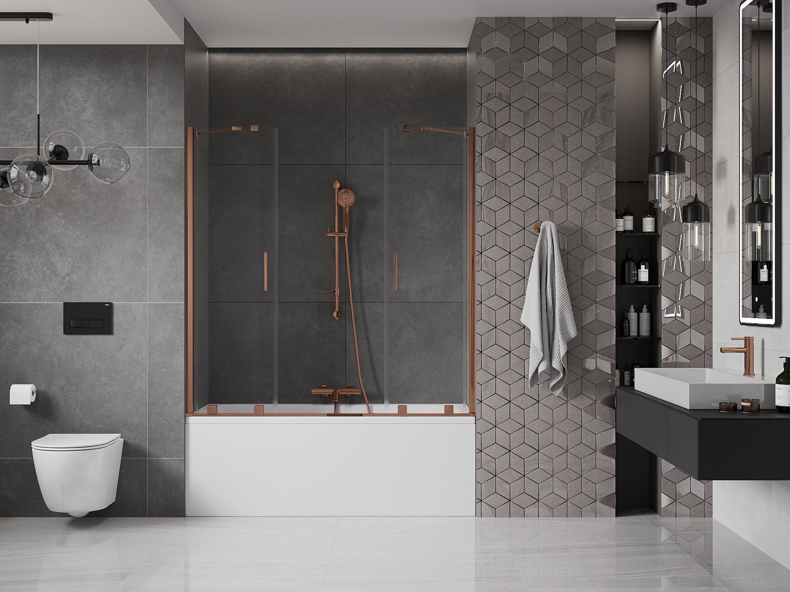Veiksminga apsauga nuo vandens išsiliejimo maudymosi metu. Ekrane yra antspaudai, kurie puikiai prisitaiko prie stiklo stiklo ir vonios krašto. Funkcinis sprendimas, užtikrinantis saugumą ir lengvą priežiūrą.