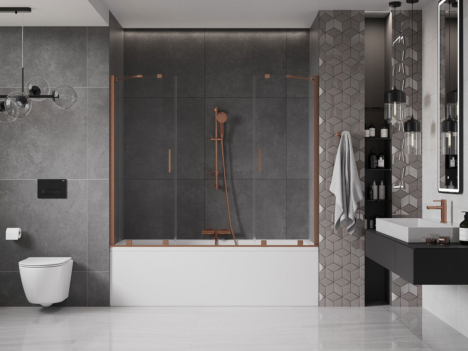 Mexen Velar Duo vonios užuolaidos 2-jų durų stumdomos 170 x 150 cm, permatomas, šepečiuotas varis - 896-170-000-02-65