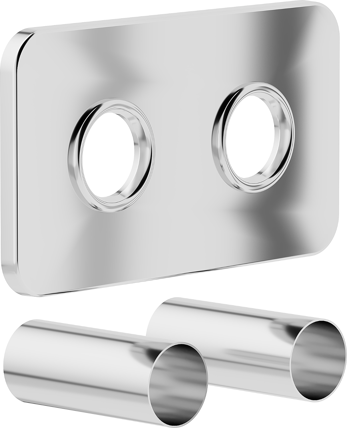Maskavimo komplektą sudaro dviguba rozeta ir dvi gemblės, skirtos termostatiniams rinkiniams ir radiatorių vožtuvams montuoti