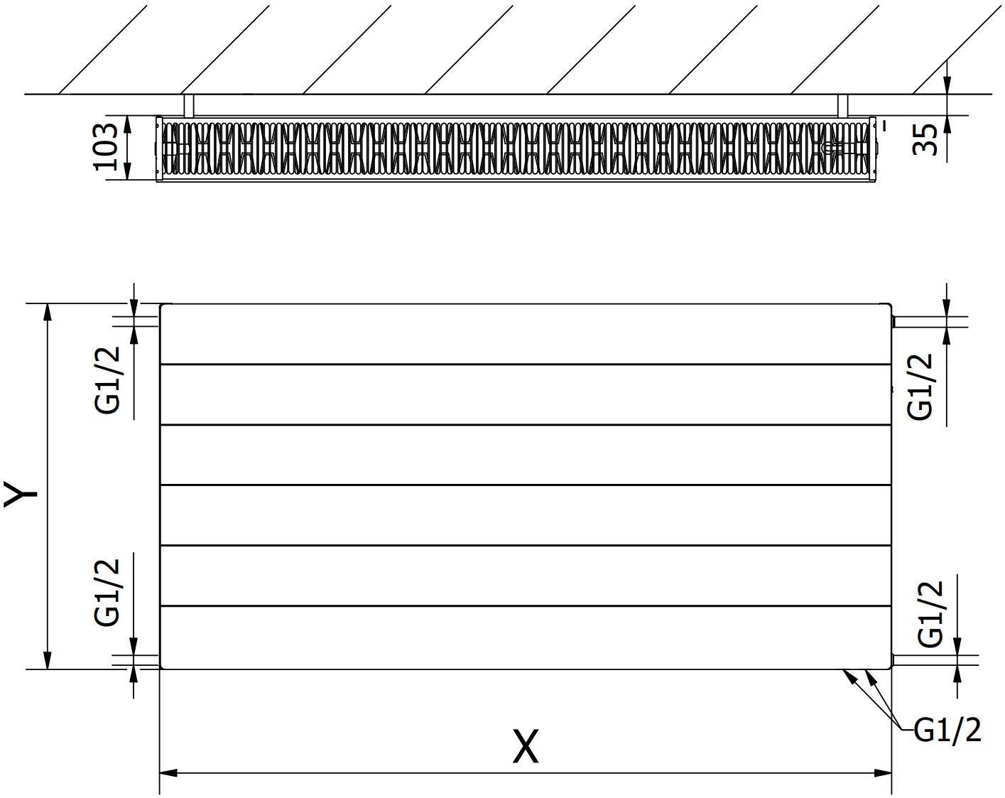- 2xG ½″ apačioje dešinėje arba kairėje pusėje