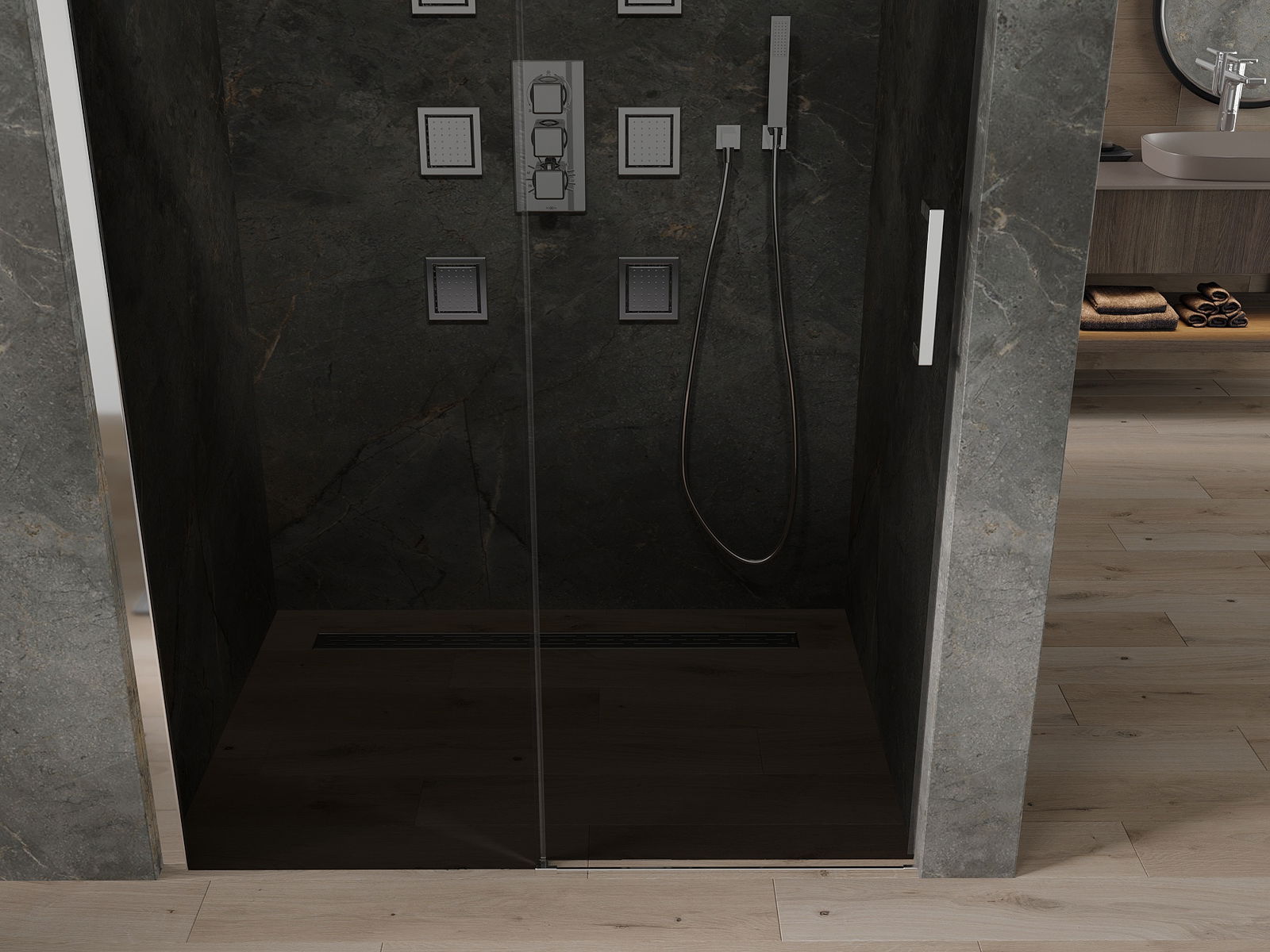 Priklausomai nuo jūsų poreikių, produktą galima pritvirtinti prie dušo dėklo ir tiesiai ant grindų. Universalus montavimo metodas leidžia pritaikyti produktą prie įvairių tipų vonios kambarių ir sukonfigūruoti vietos.